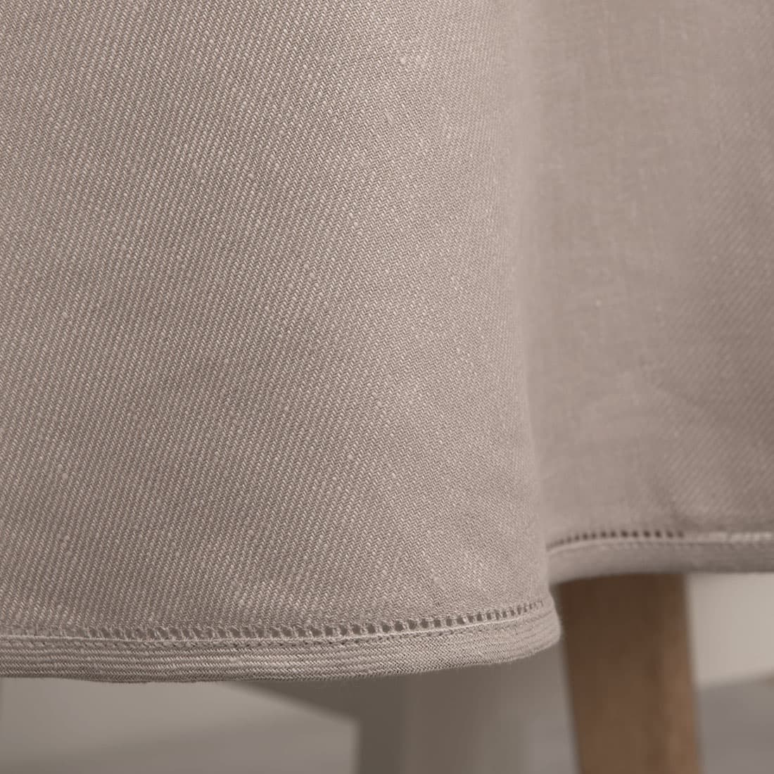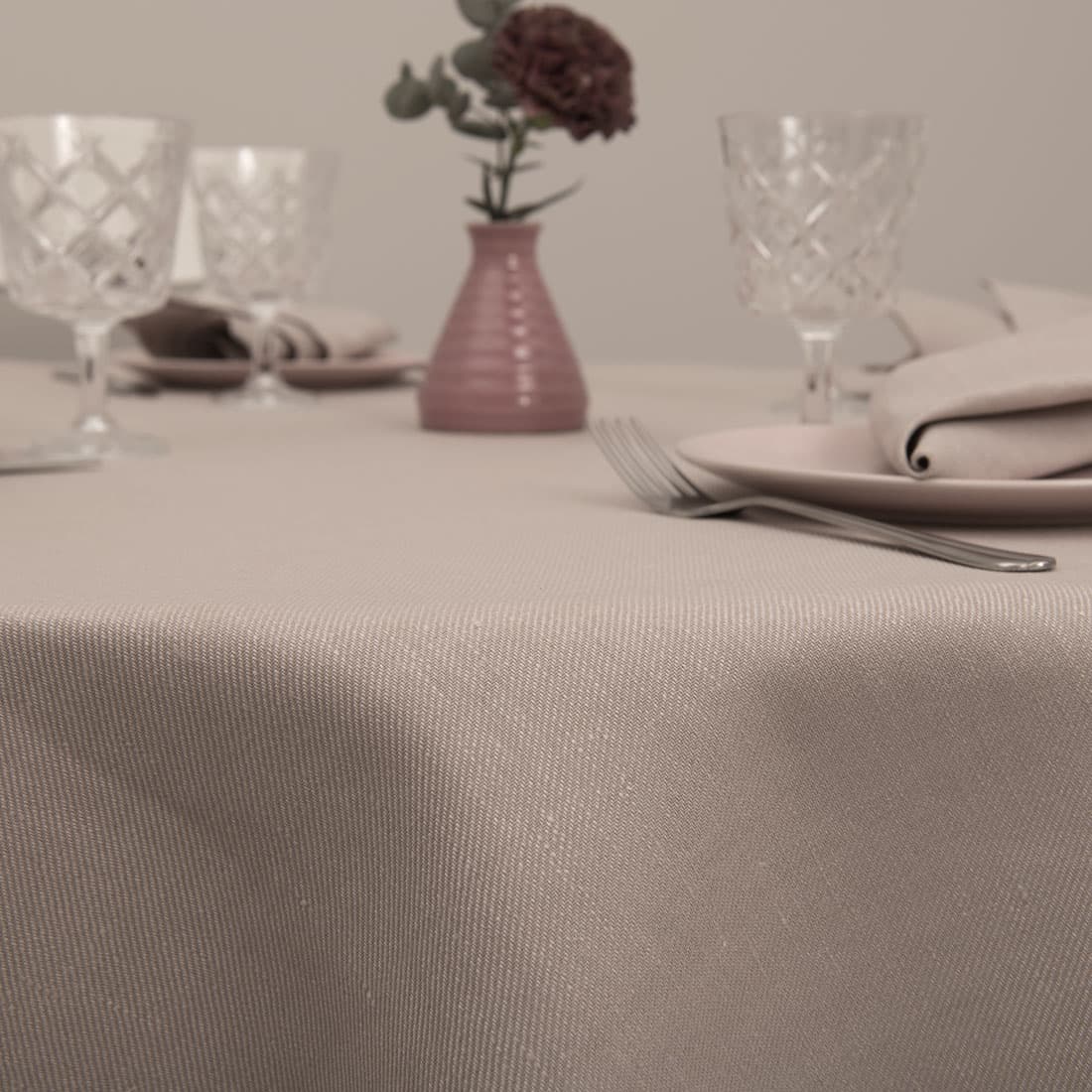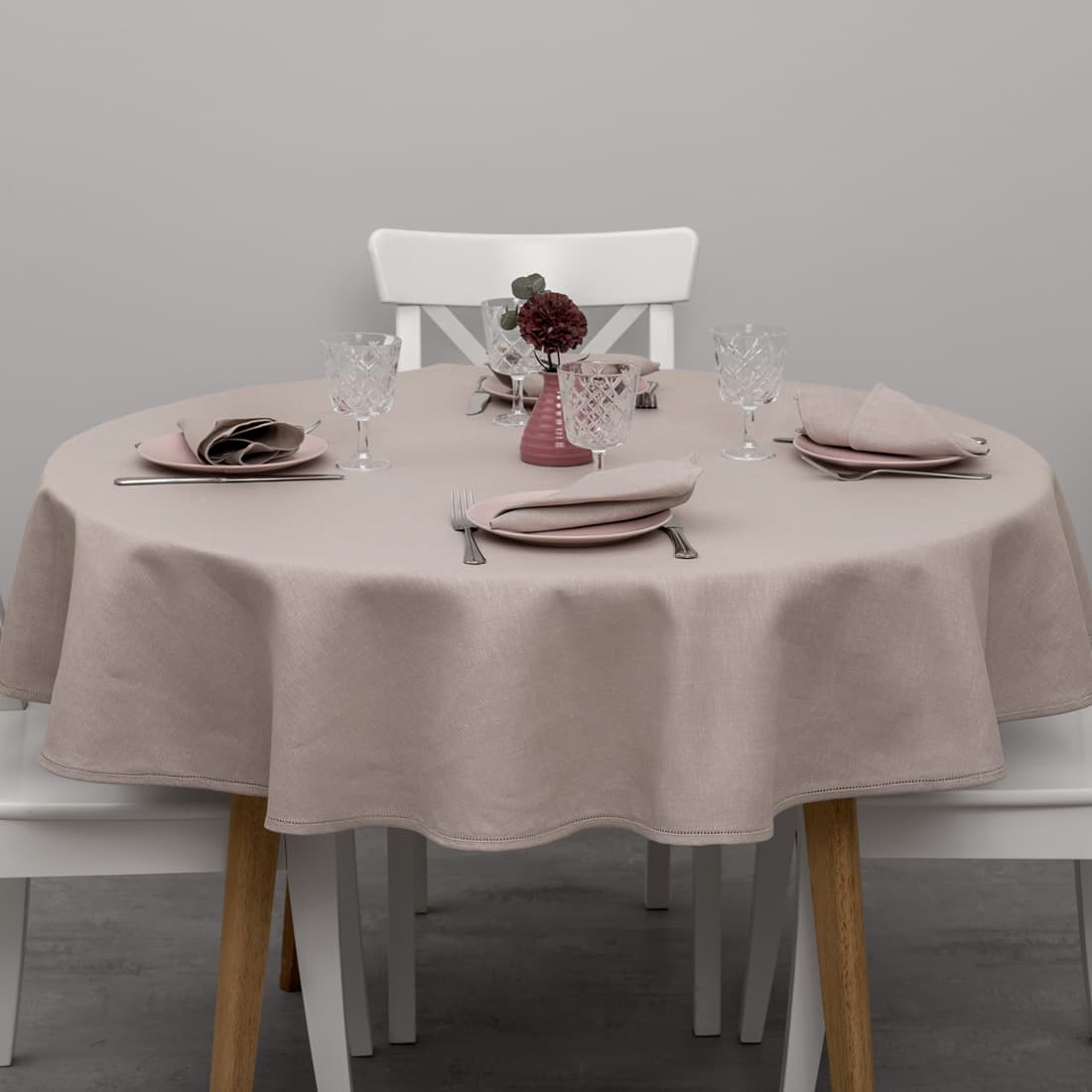Rundt (oval) gråaktig rød duk laget av gråaktig rød bomulls og lyserosa lingarn. Kanter er pyntet med hullmønster. Veldig universal duk som kommer til å passe til alle anledninger. Kombiner med servietter av samme stoff og farge.