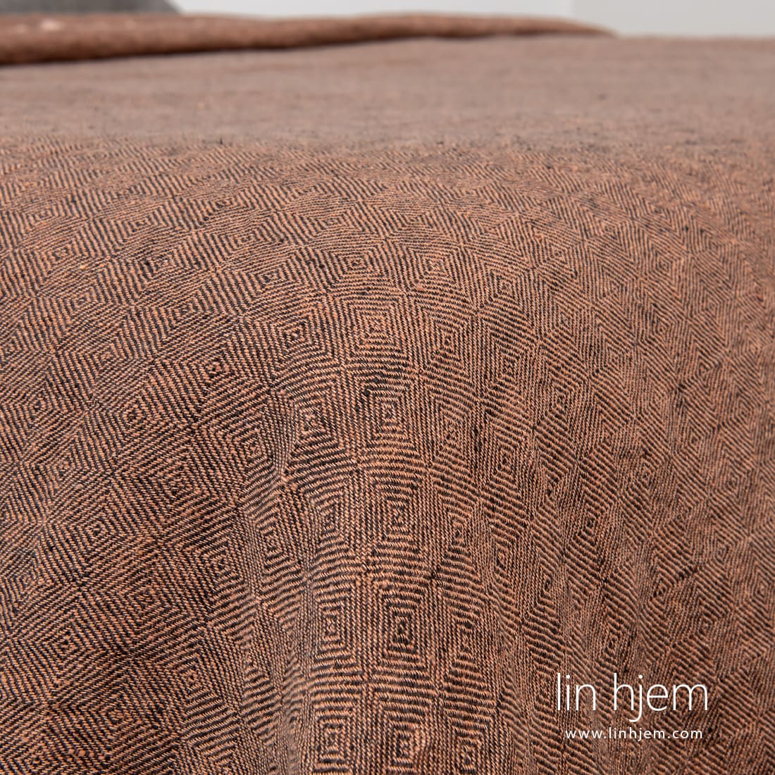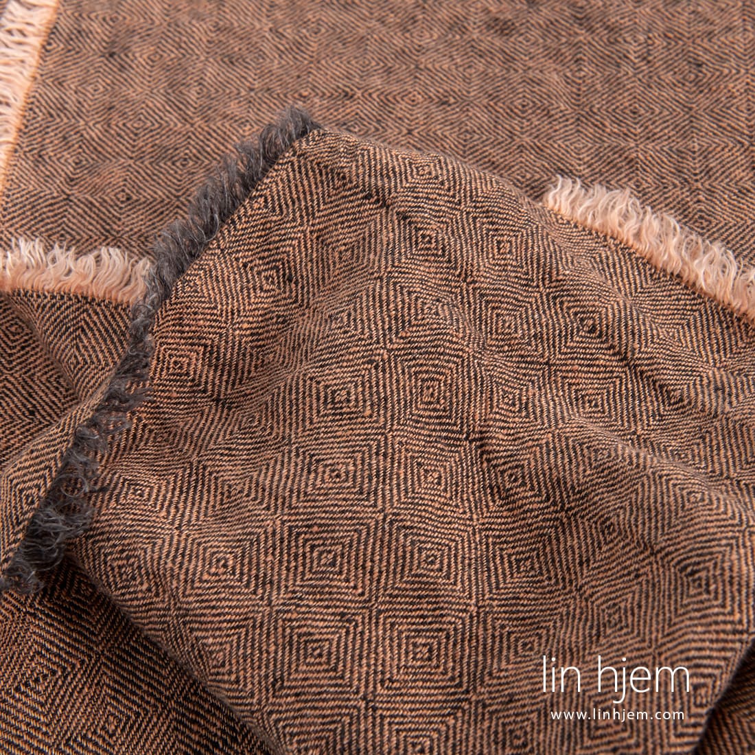 Brunt sengeteppe av lin vevd fra mørkegrå og brune garn dekorert med romber mønster. Sengeteppet har også 1,5cm lange frynser. Produktets stoffet er spesielt vasket for å gjøre det mykt, skånsomt og behagelig mot huden. Sengeteppet finnes i flere ulike størrelser. Dekorer sitt soverom med dette fine sengeteppet!