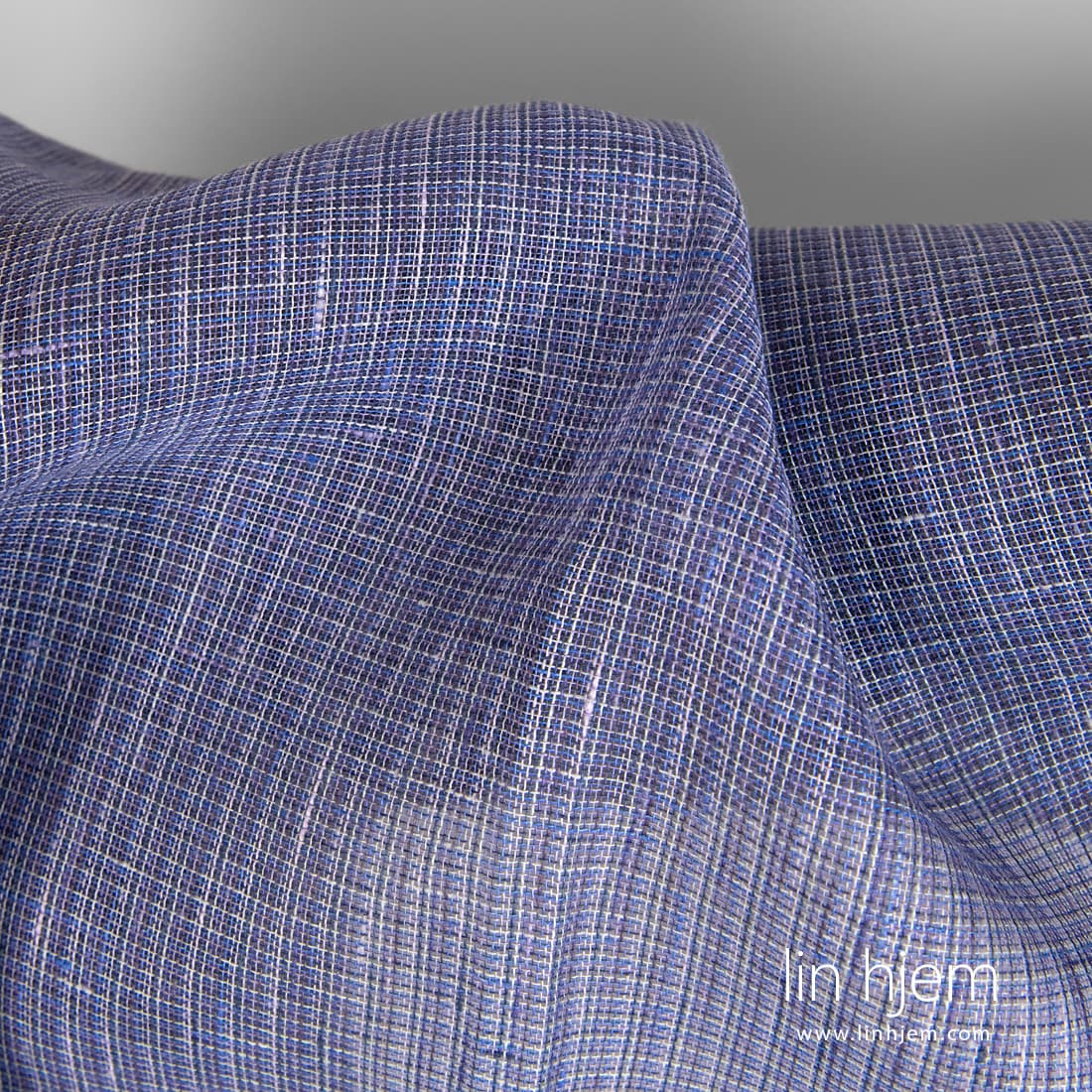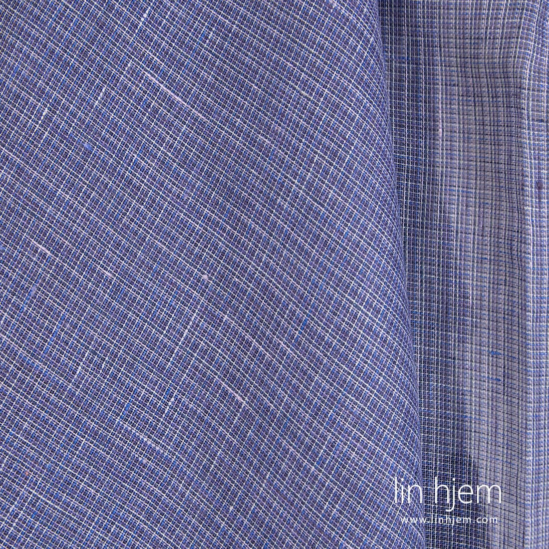 Lilla rutete gjennomsiktig linstoff. Stoffet er vevd av flere nyanser av lilla, blå-grå, blå og gråaktig garn. Lett, løstvevd 100% linstoff som passer til å sy skjerf eller gardiner.