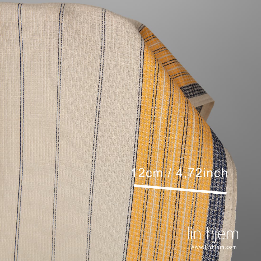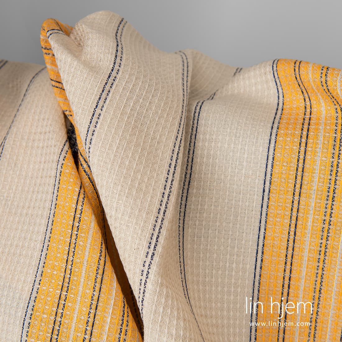 • Lin-bomull vaffel stoff beige med gule og blå striper