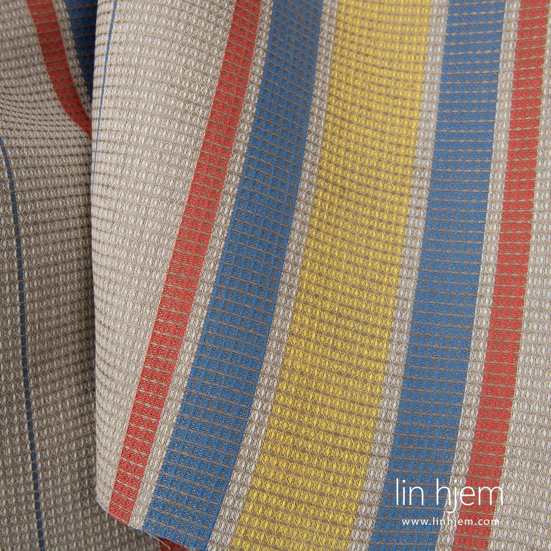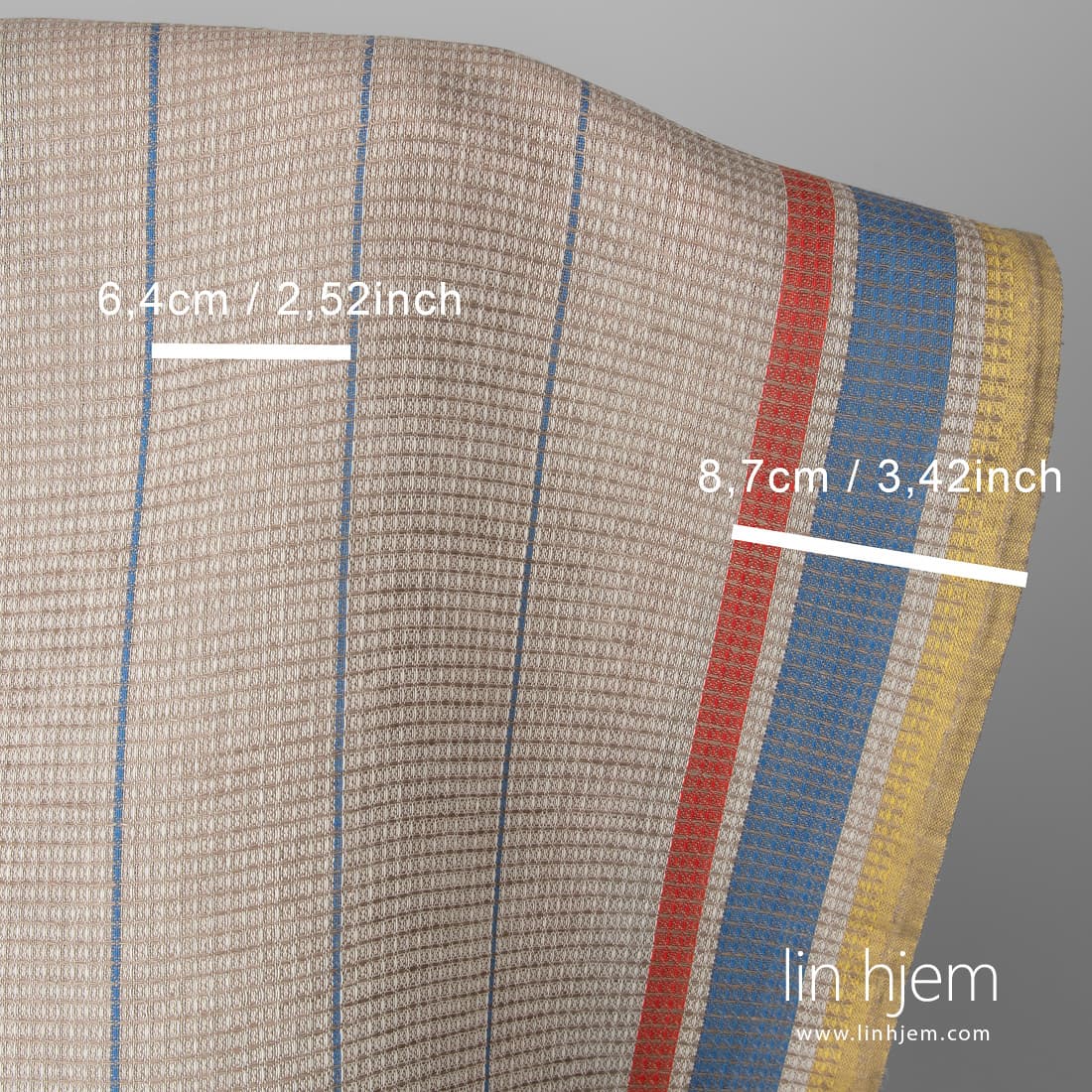 • Lin-bomull vaffel stoff med striper vevd av hvit, blått, gult, rødt og mørk beige garn