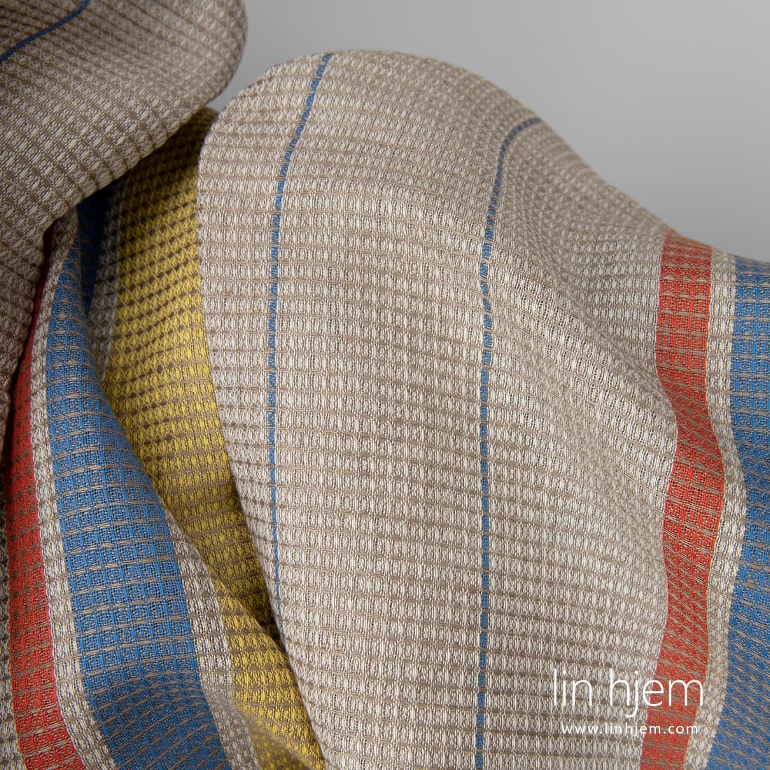 • Lin-bomull vaffel stoff beige med gule og røde striper
