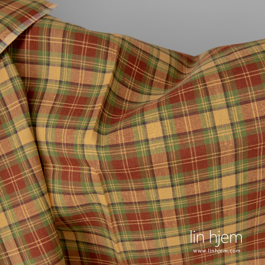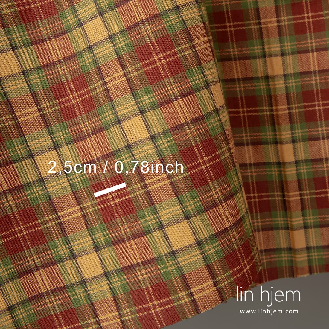 • Rutete lin-bomullsstoff vevd av mørk rød, grønn, gul og mørk brun garn