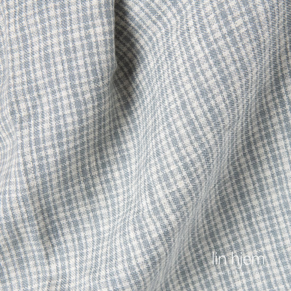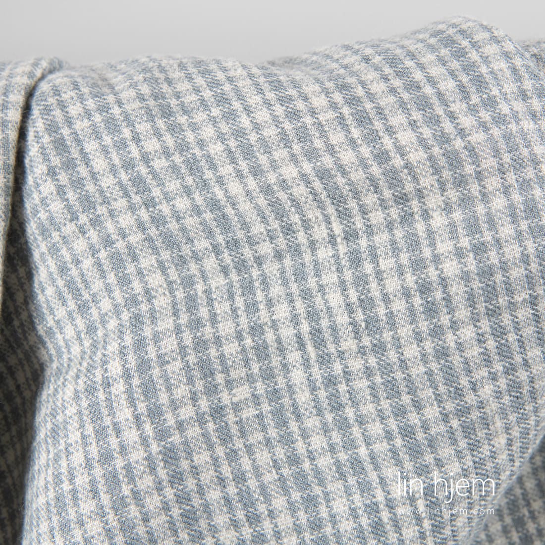 Lin-ull vasket stoff i grå ruter. Stoffet ble vevd av gulaktig og grå lin og ull garn. Spesielt vasket stoff som er veldig mykt og skånsomt. Krymper ikke. Passer til å sy skjerf, klær, pledd osv.