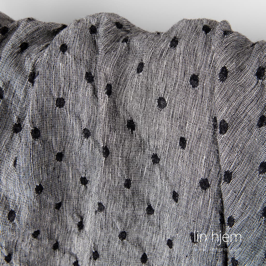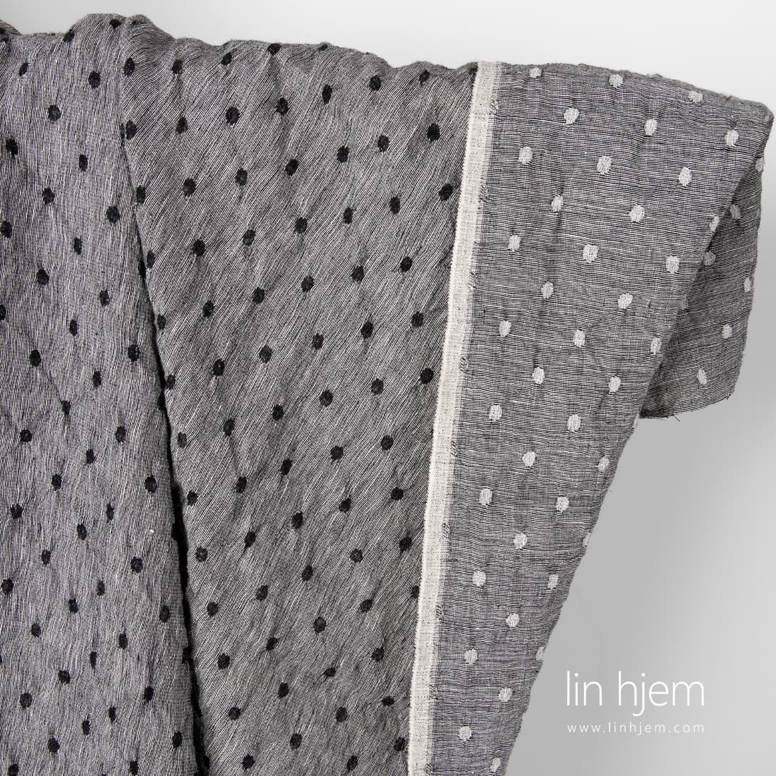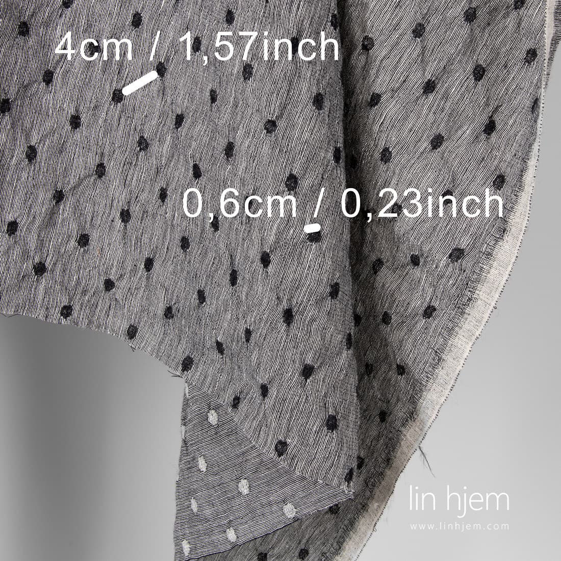 Lin-ull vasket stoff med svarte striper og bobler. Stoffet er tosidig, jacquard. På den ene siden: svarte bobler, på den andre siden: hvite bobler. Spesielt vasket for å gjøre stoffet mykt, skånsomt. Holdbart, tettvevd, middels tykkelse stoff passer perfekt til å sy varme sjal, skjerf, klær, sengetepper.