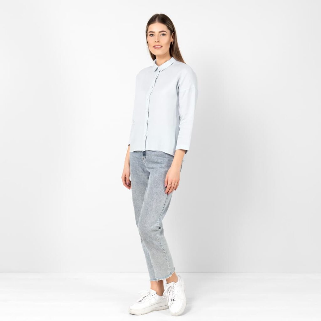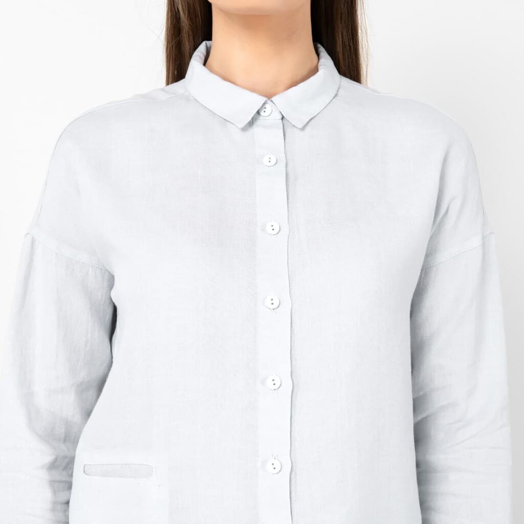 - Detaljer: klassisk skjortekrage, knappelukking foran, liten lomme på høyre side foran, bred fald på ermene