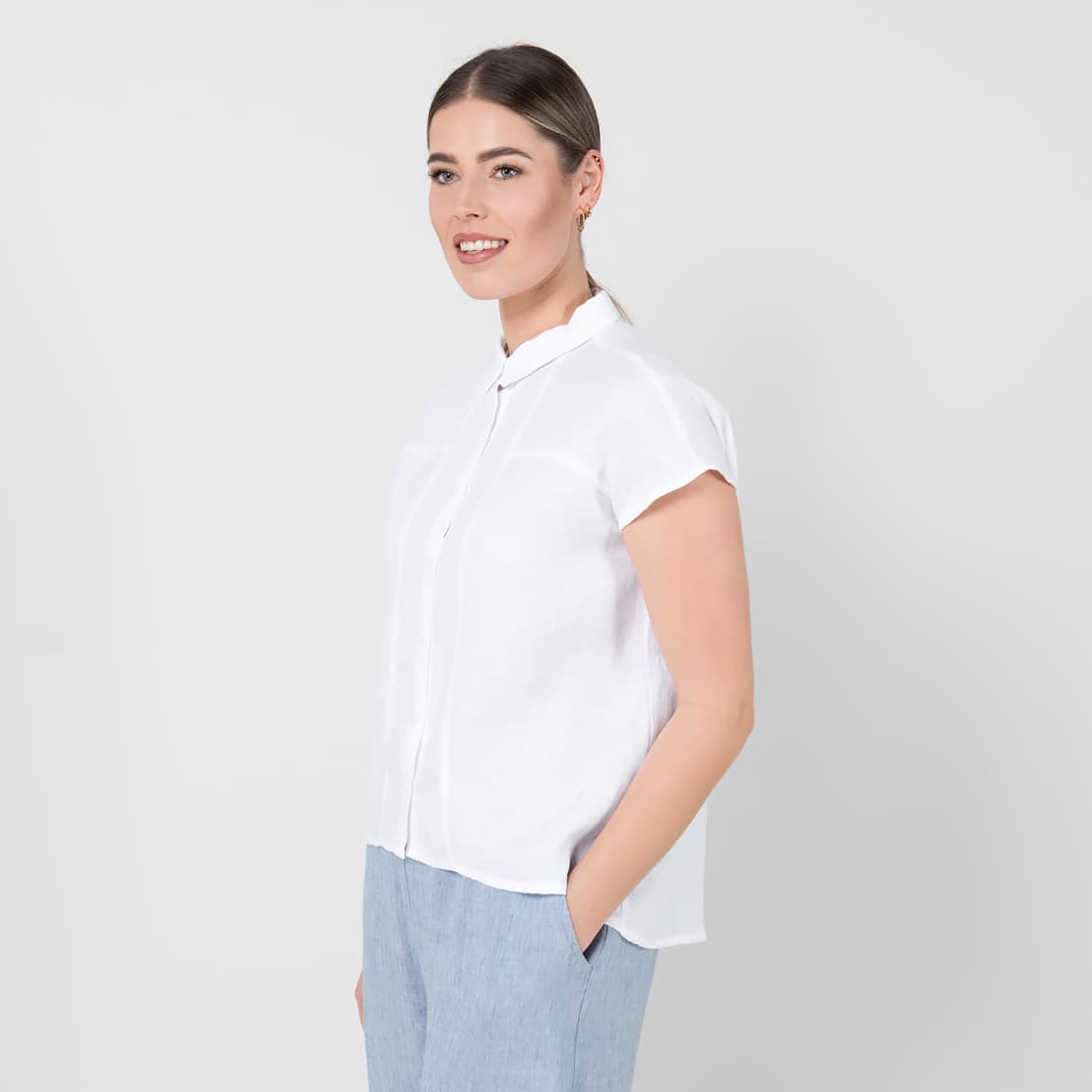 - Produktmodell: rett silhuett, korte ermer
