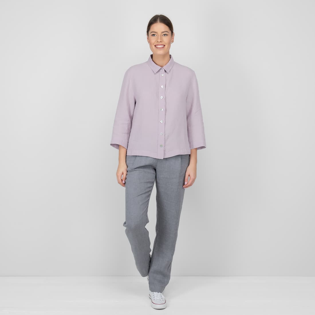 - Produktmodell: oversized rett silhuett skjortestil, hoftelengde, 3/4 ermer