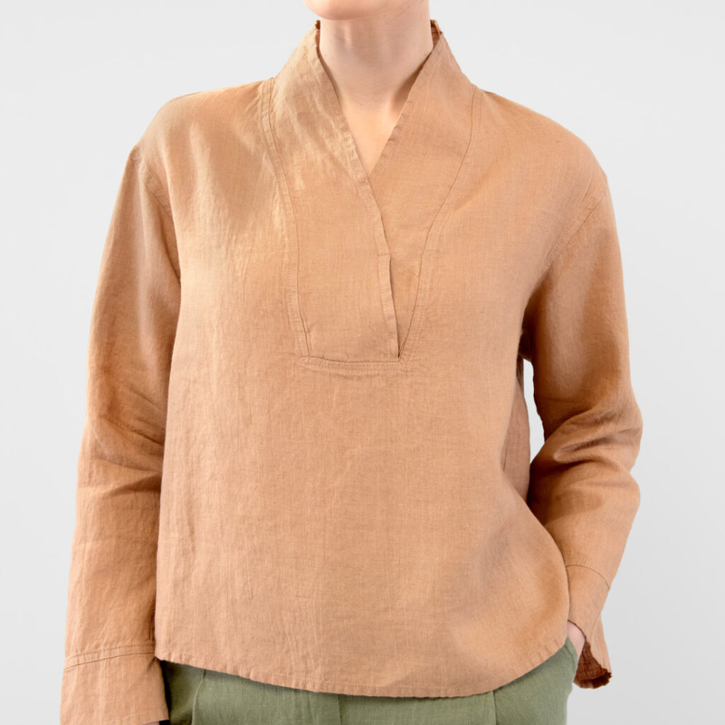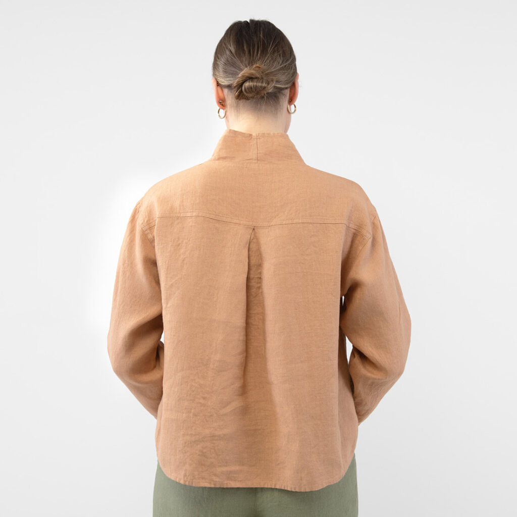 - Detaljer: bred ståkrage med splitt i V-halsen, legg bak