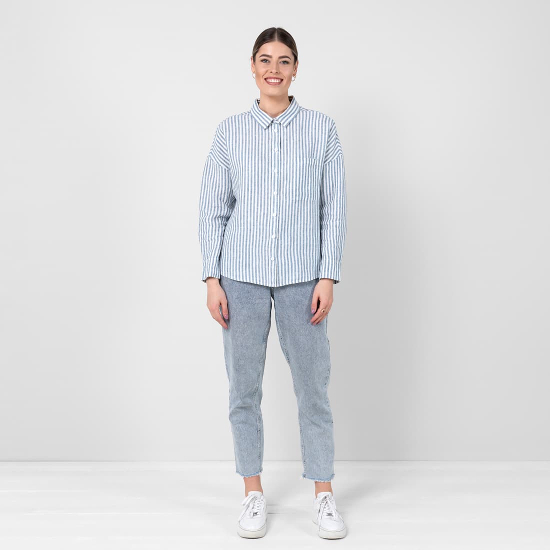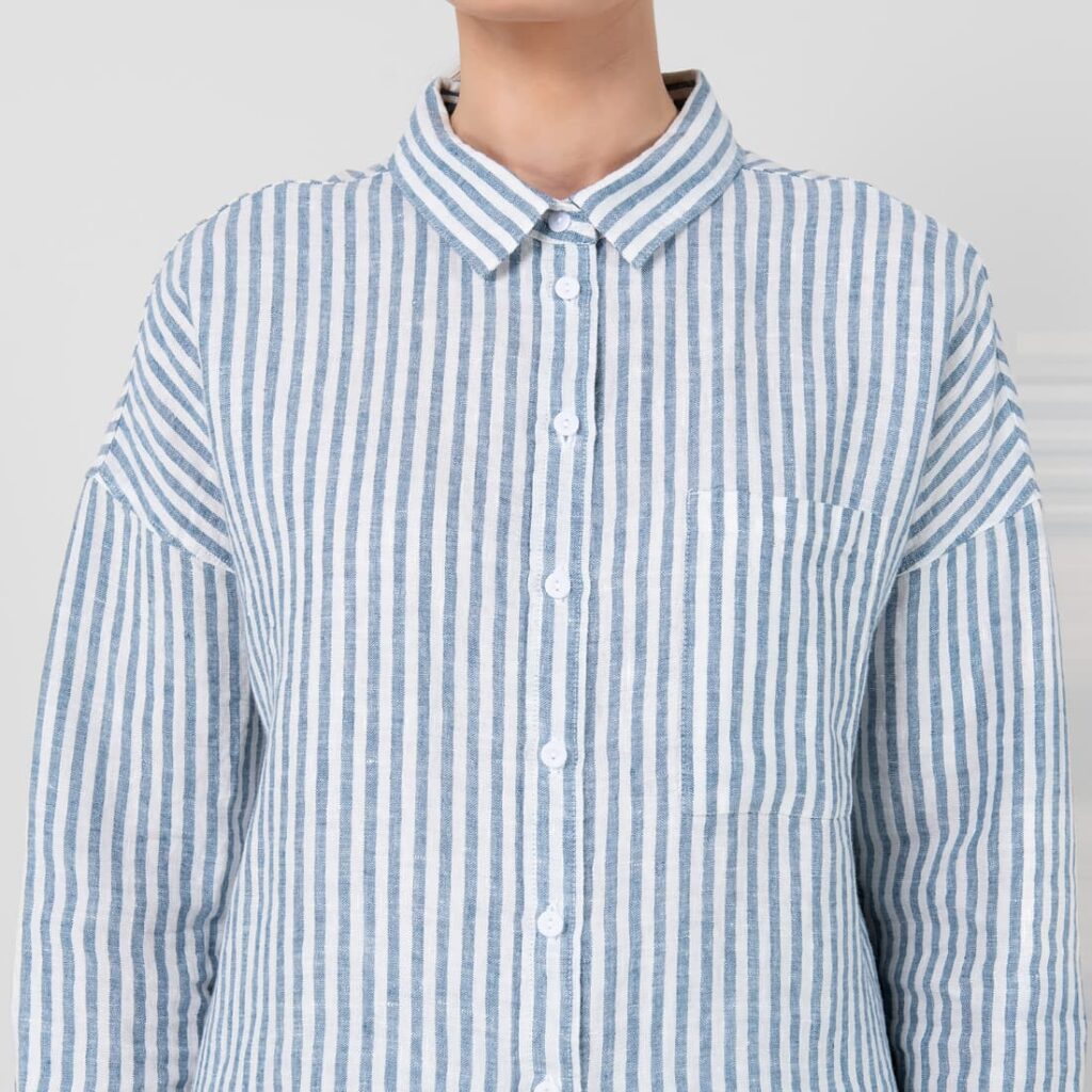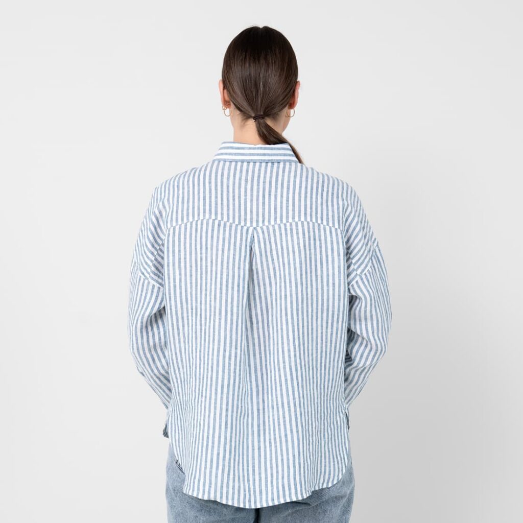- Produktmodell: oversized skjortestil, hoftelengde, lange ermer