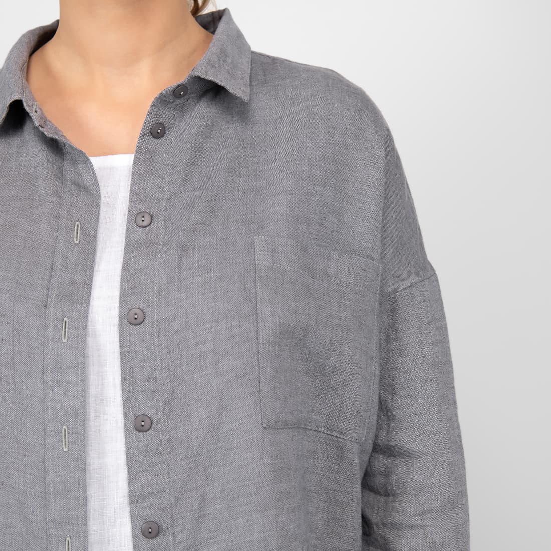 - Detaljer: vanlig skjortekrage; knappelukking foran, stor lomme på venstre side foran, lengre bakside, splitter i sidene, avrundet nederkant