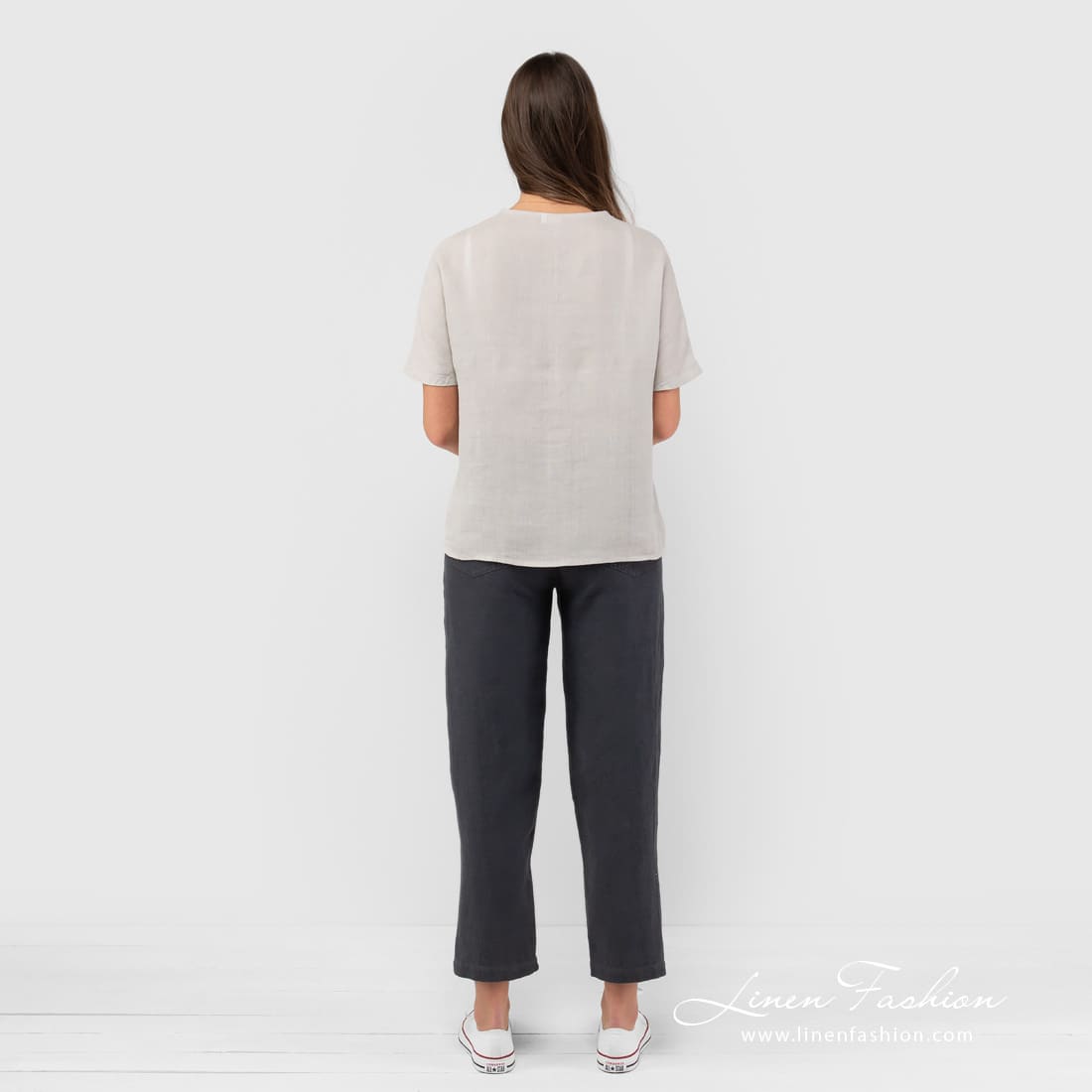 - Produktmodell: løs silhuett, asymmetrisk bunn, korte ermer, hoftelengde