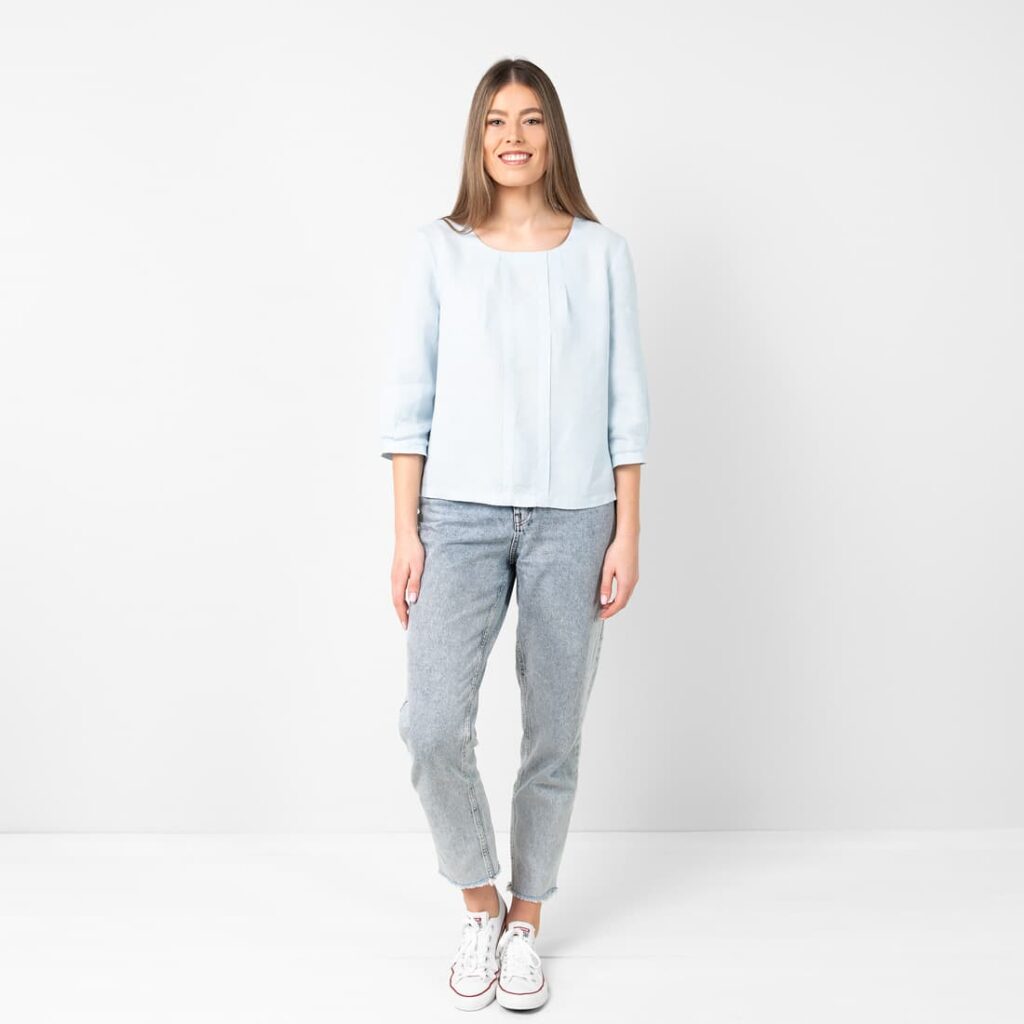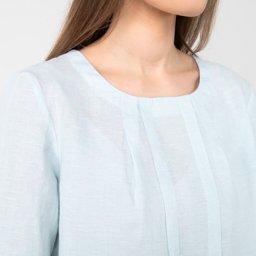 - Detaljer: rund hals med legg, to legg i full lengde foran, 3/4 ermer med legg over mansjettene, knappelukking bak