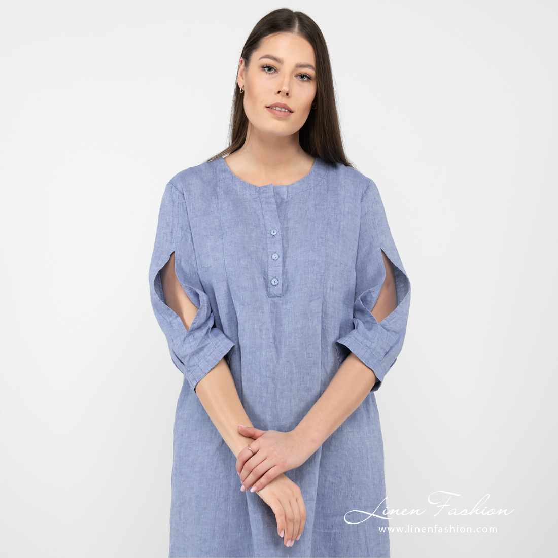 - Produktmodell: løs silhuett, lengde over kneet, 3/4-ermer med splitter
