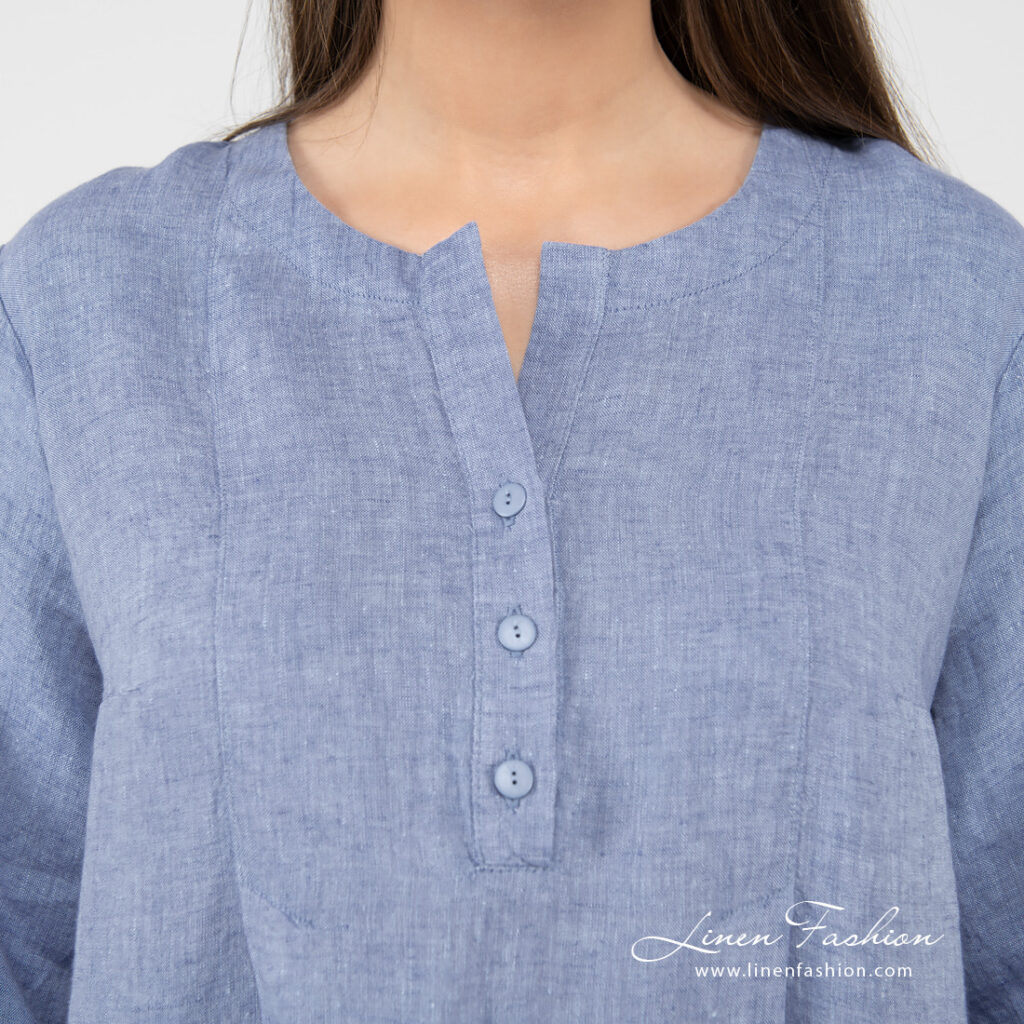 - Detaljer: rund halsåpning med knappelukking, fold i ryggen, lommer i sidene