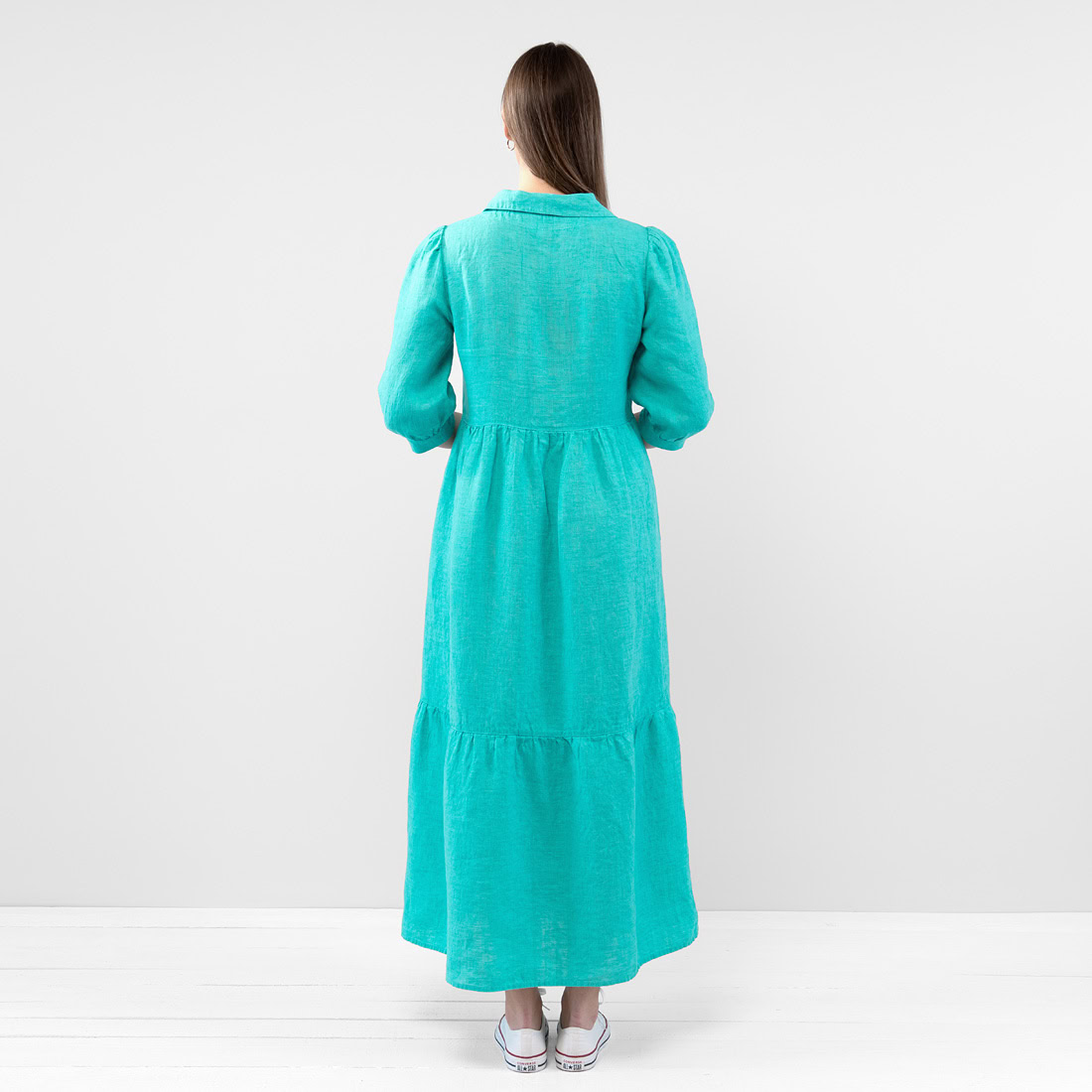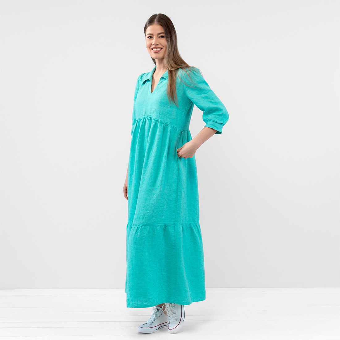 - Produktmodell: lett A-linje-silhuett, løs passform, maksi-lengde, 3/4 puffermer