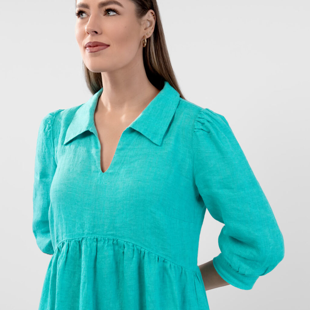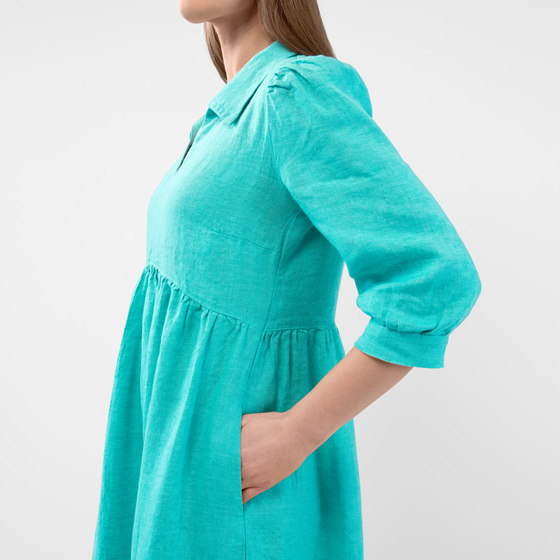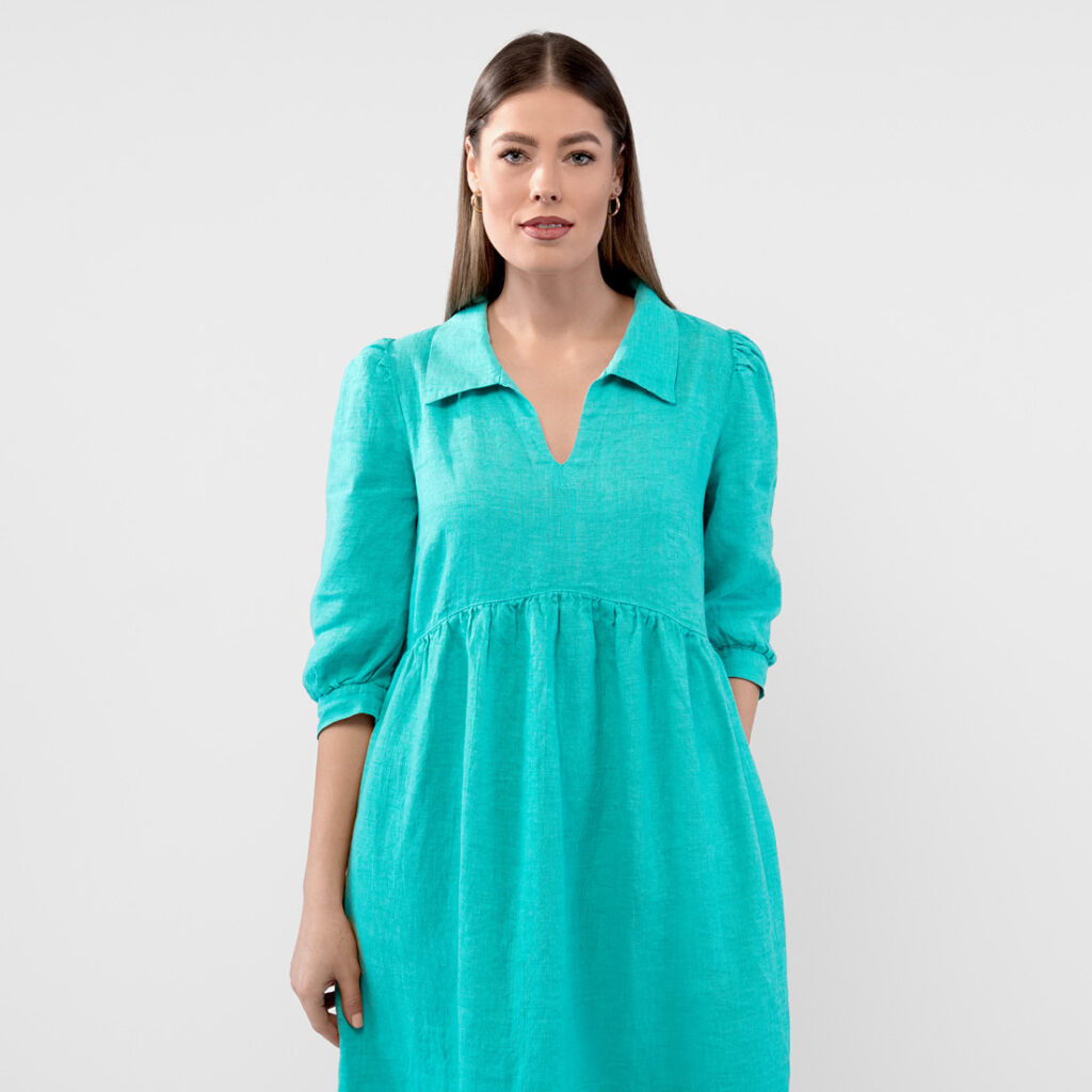 - Detaljer: V-hals med krage, rynket under brystet, sidelommer