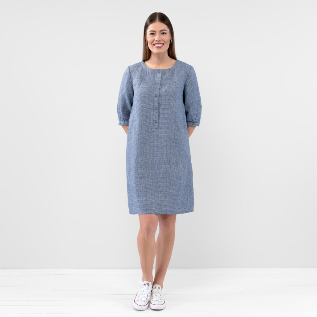 - Produktmodell: rett silhuett, avslappet passform, lengde over kneet, 3/4 puffermer