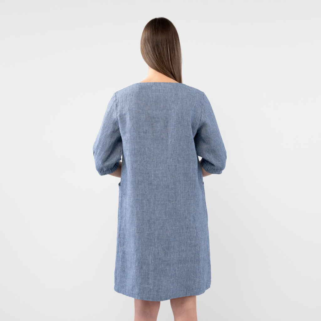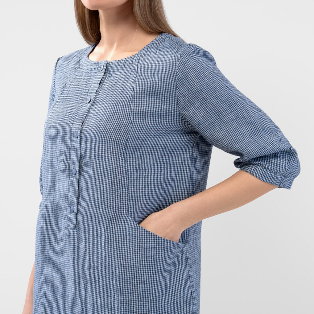 - Detaljer: rund halsåpning med delvis knappestolpe, to sidelommer