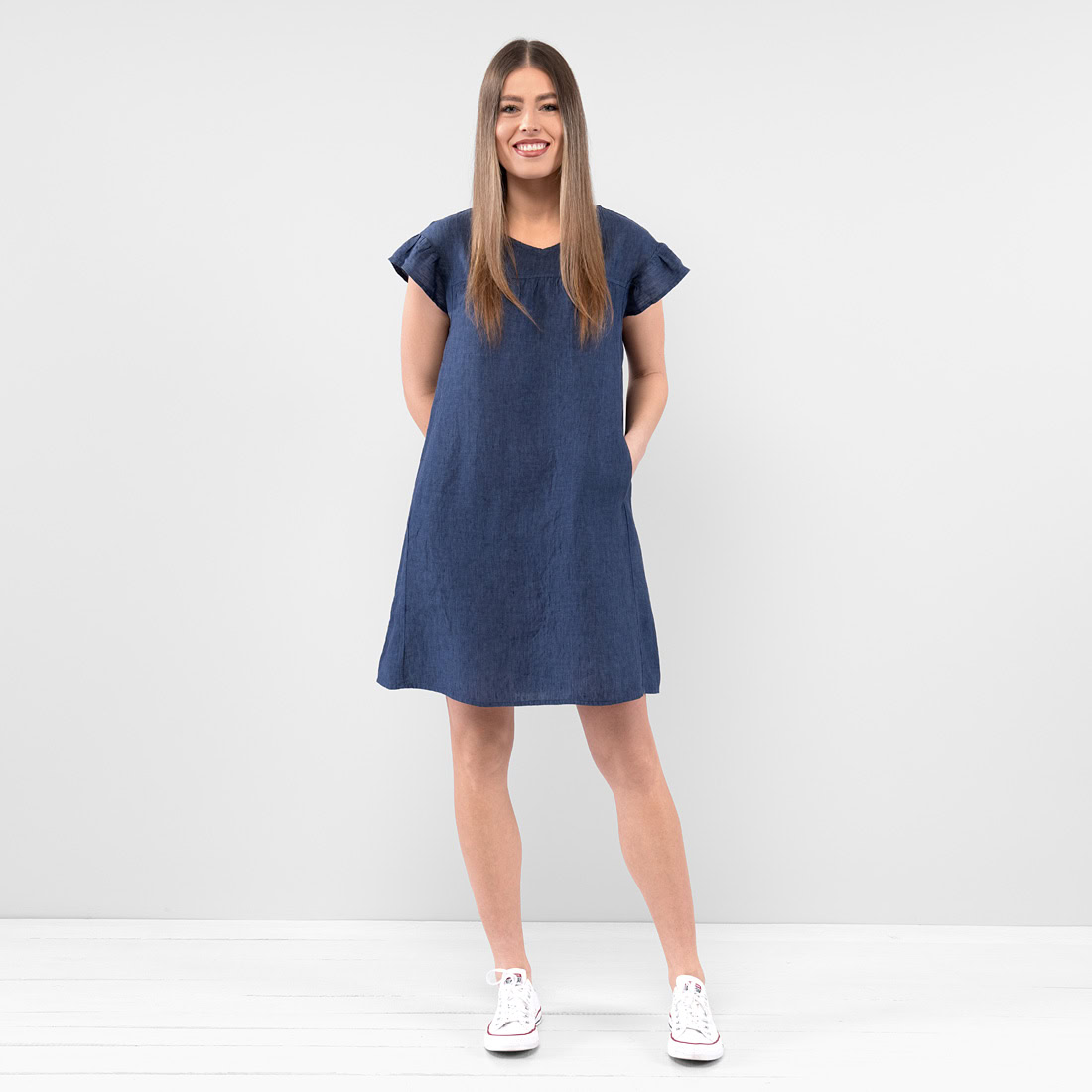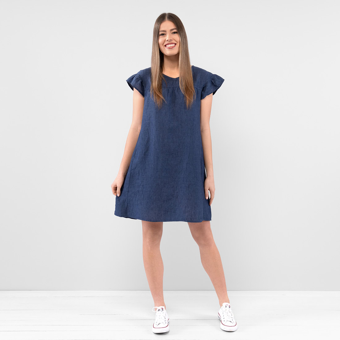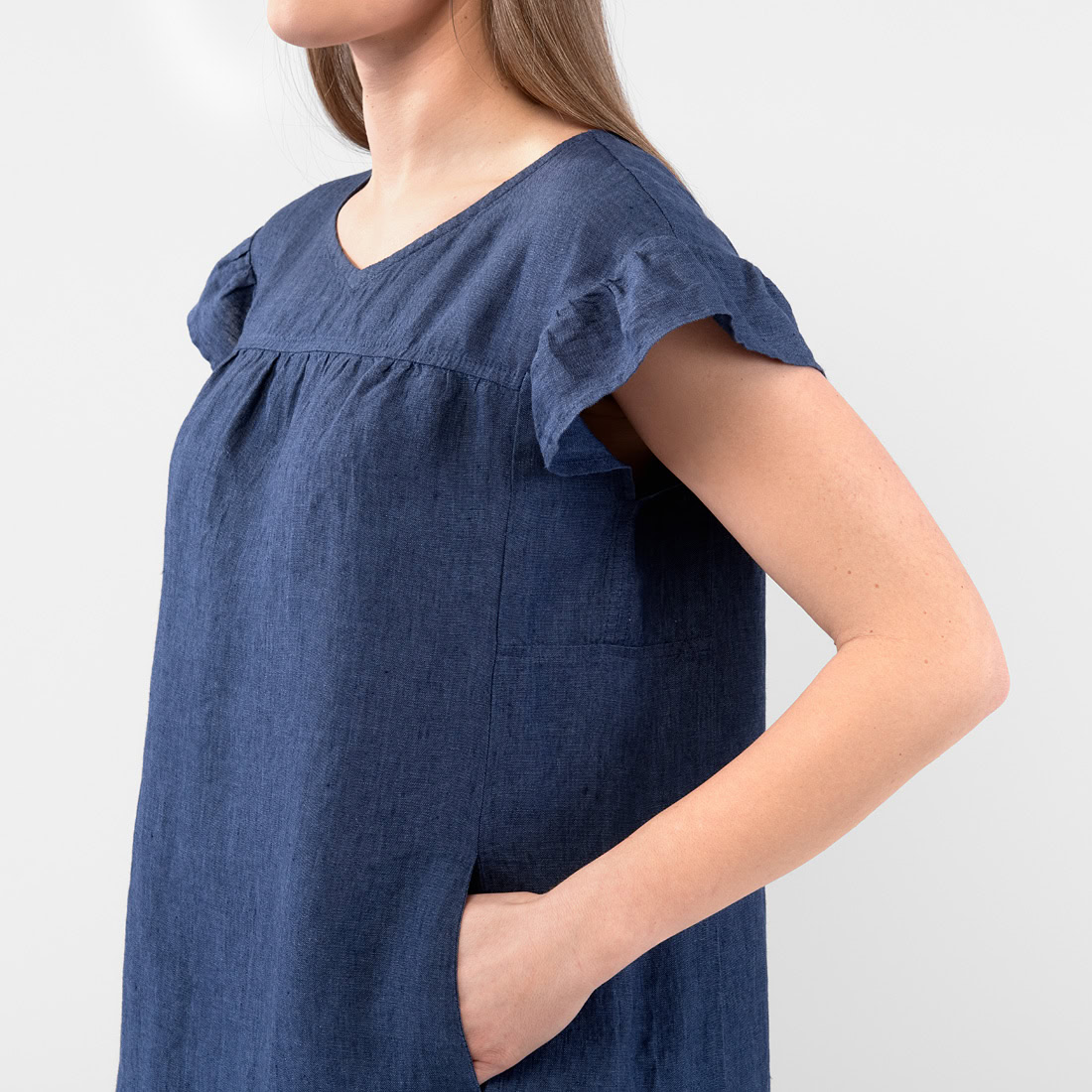 - Produktmodell: rett silhuett, løs passform, lengde over kneet, korte volangermer