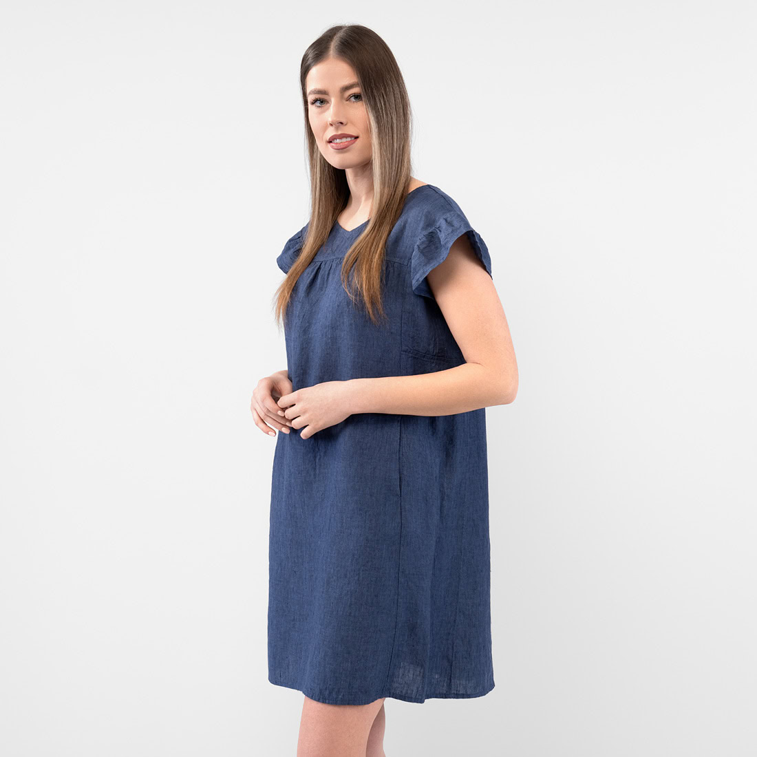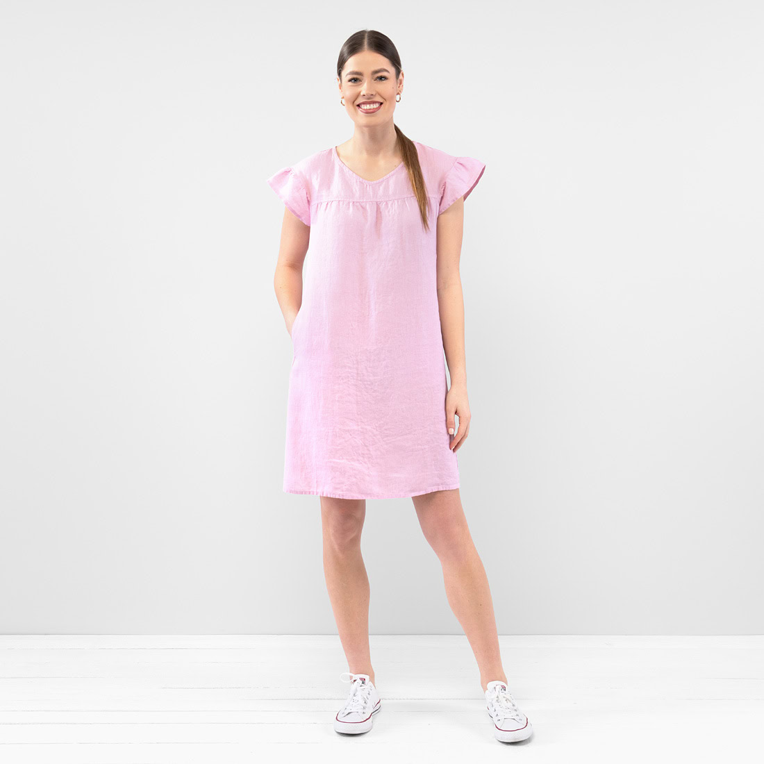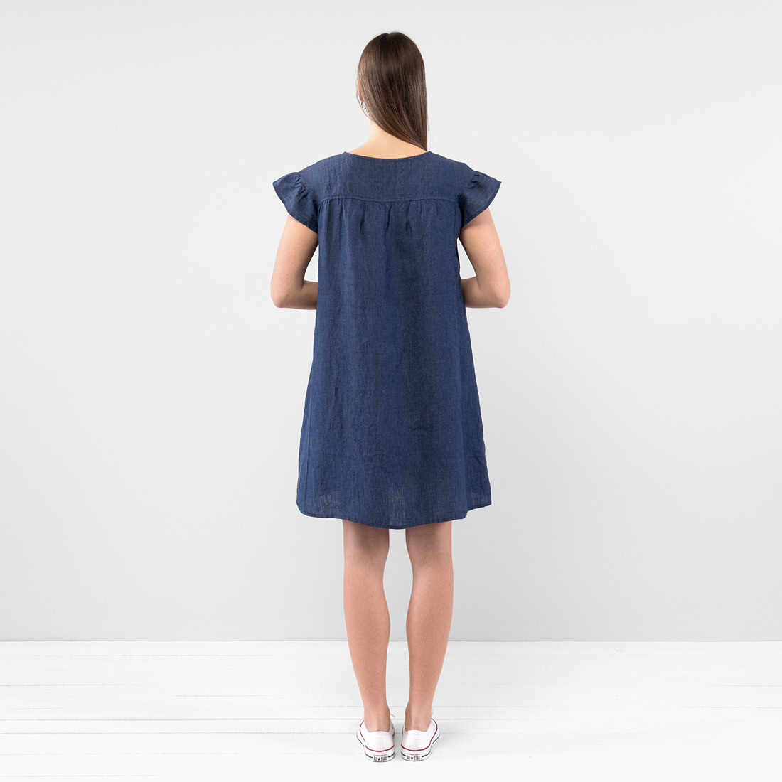 - Produktmodell: rett silhuett, løs passform, lengde over kneet, korte volangermer