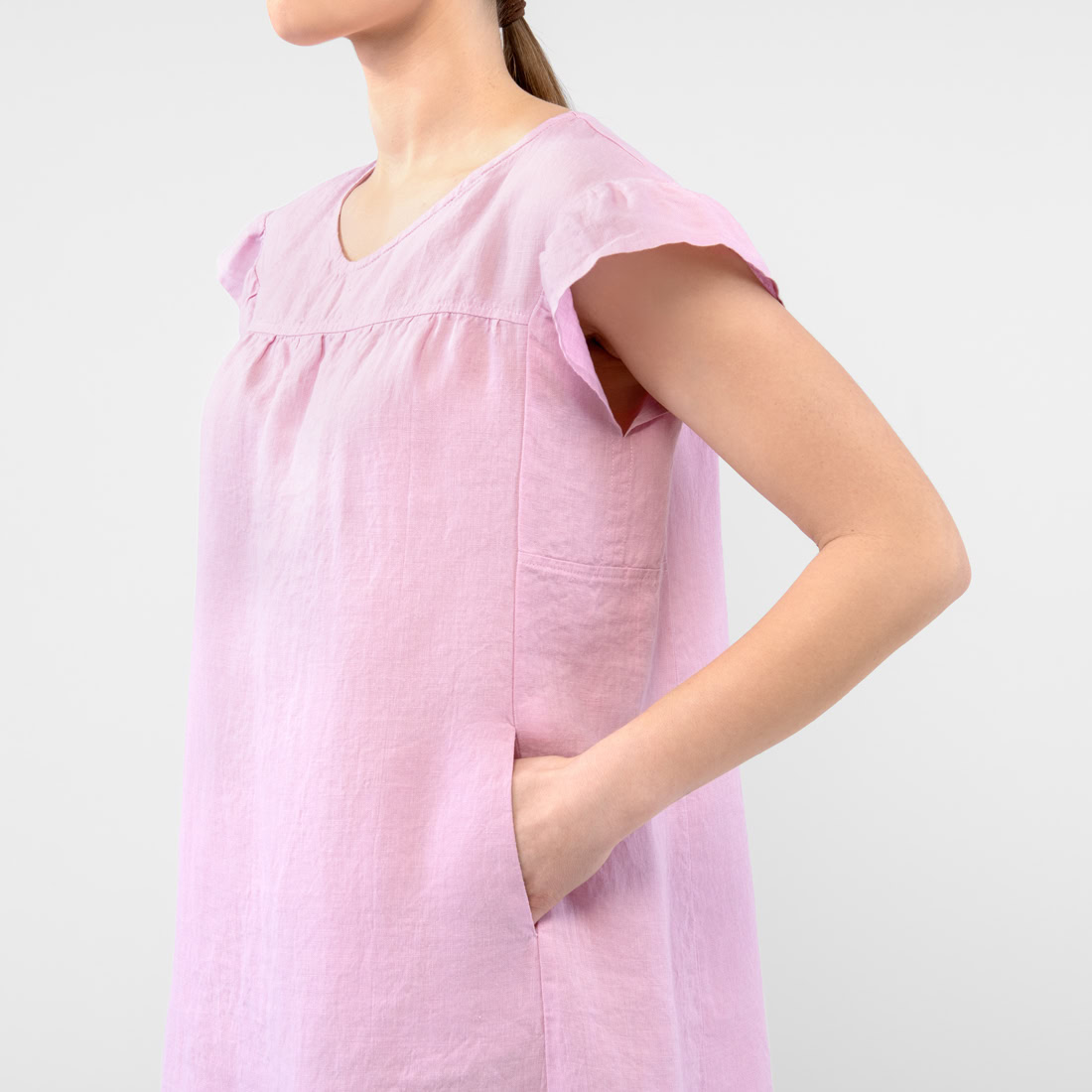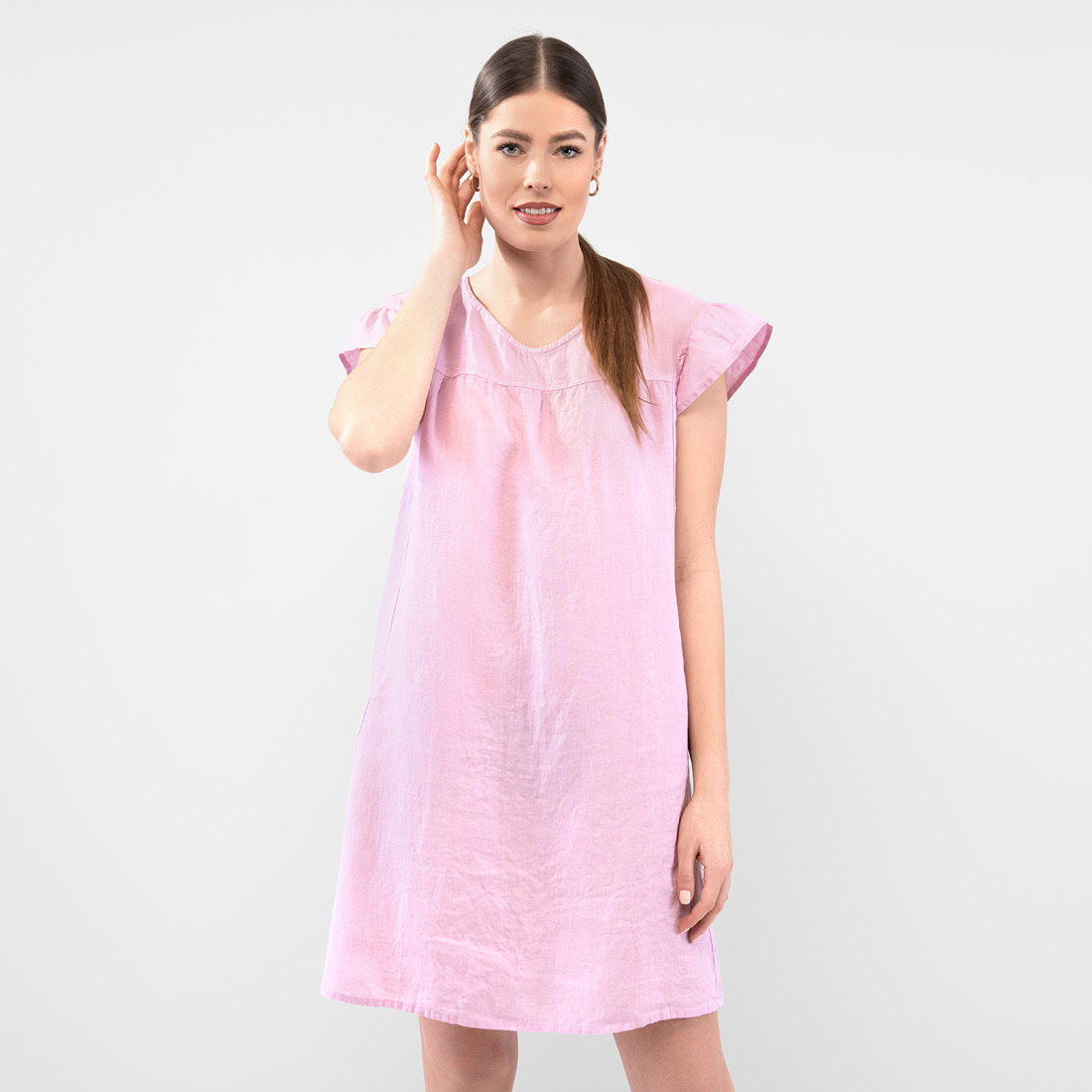 - Produktmodell: rett silhuett, løs passform, lengde over kneet, korte volangermer