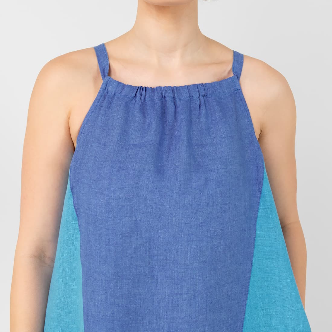 - Detaljer: rund hals, stropper som knytes i ryggen, lengre bak