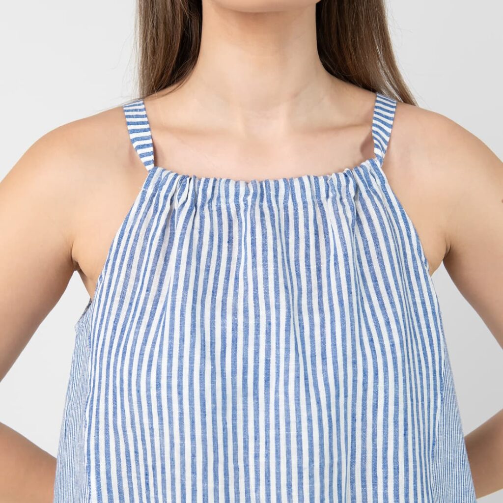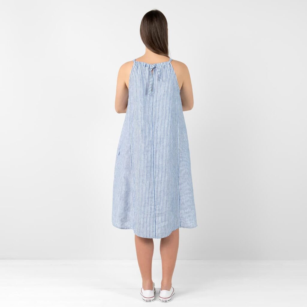 - Detaljer: rund hals, stropper som knytes i ryggen, lengre bak