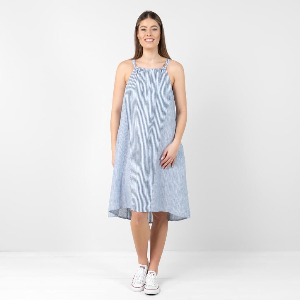 - Produktmodell: A-linje silhuett, løs passform, knelang, ermeløs