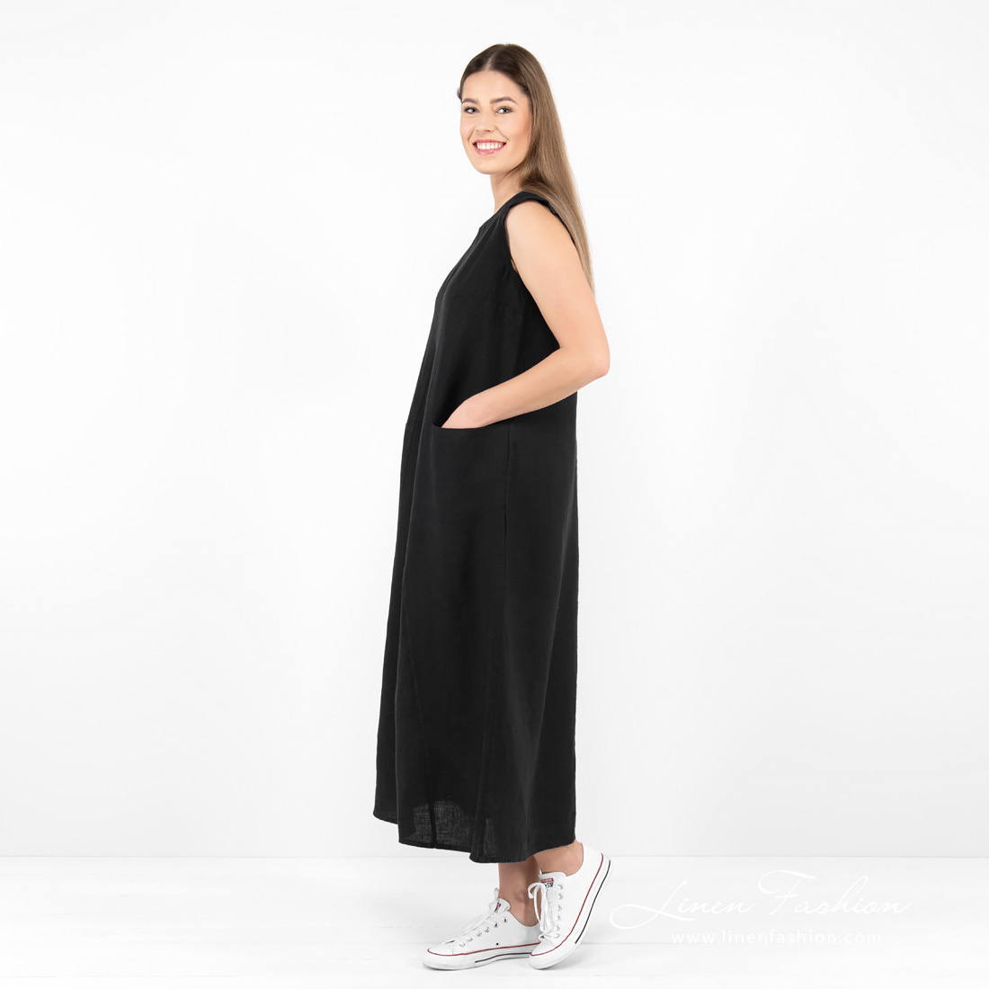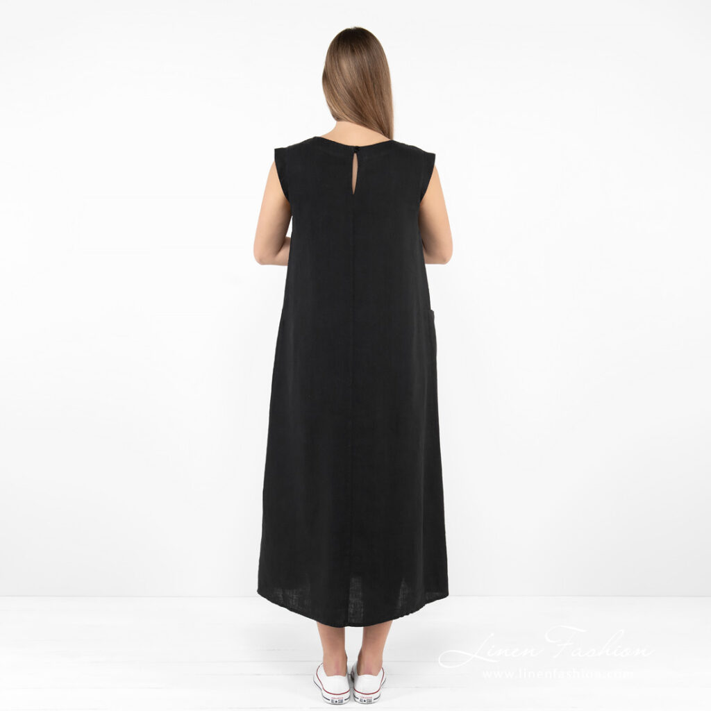 - Produktmodell: A-linje-silhuett, løs passform, midi-lengde, ermeløs