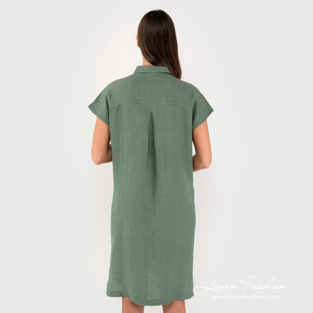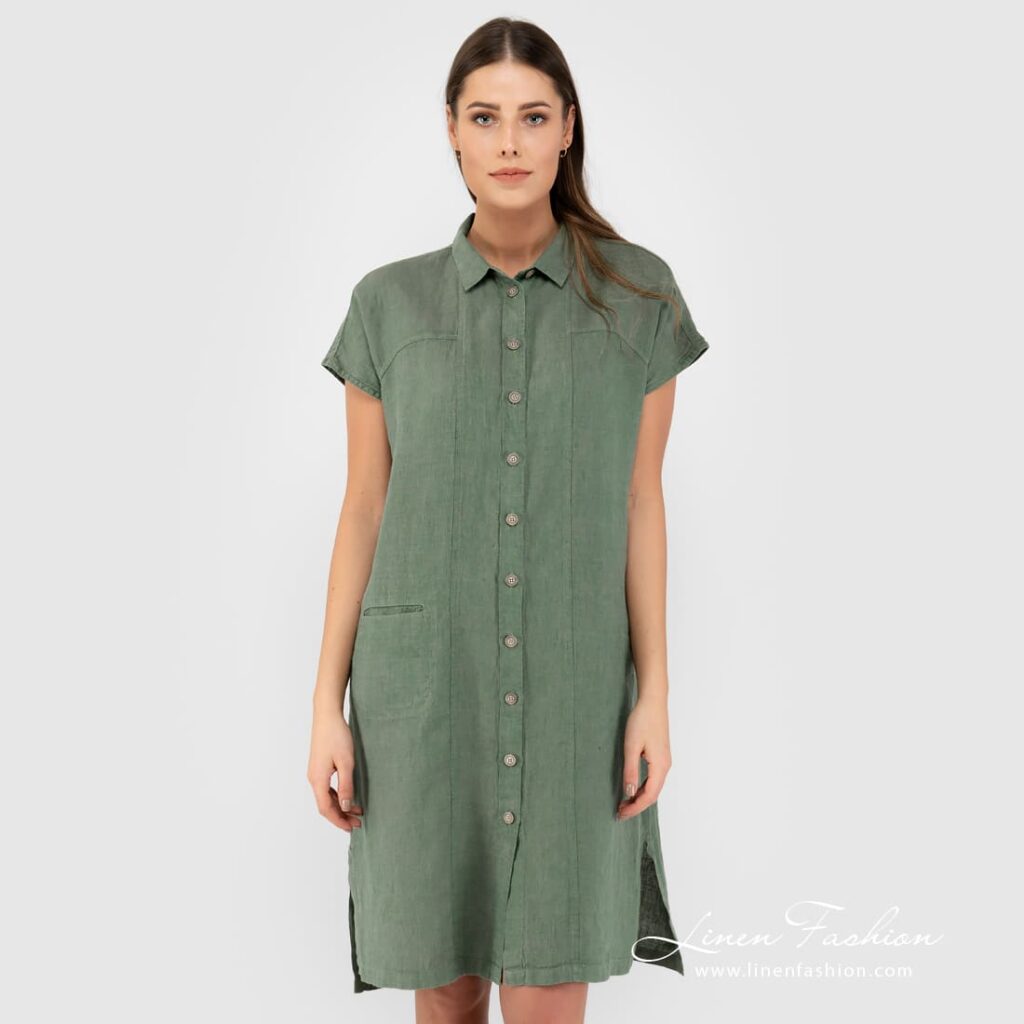 - Produktmodell: rett silhuett, løs passform, lengde over kneet, korte ermer