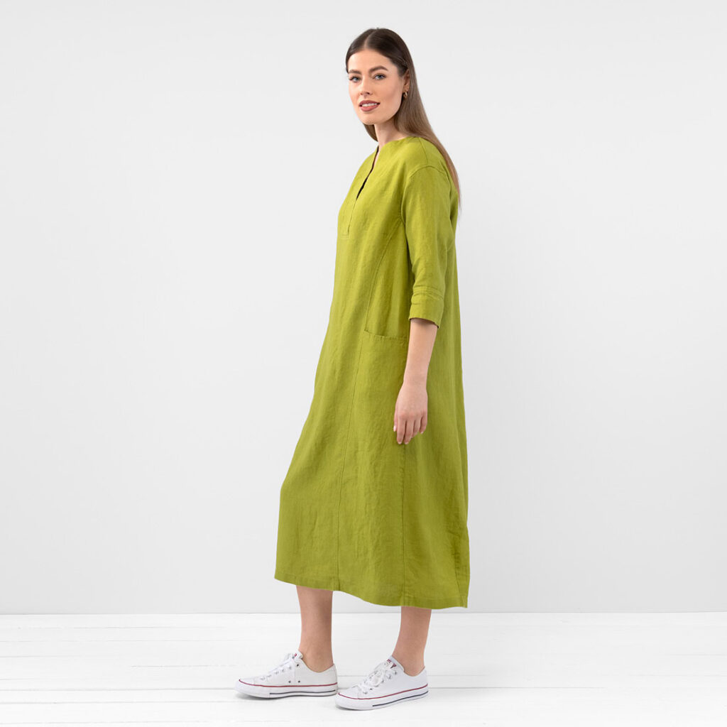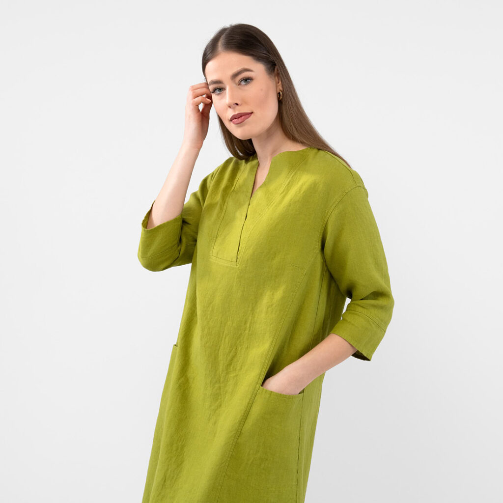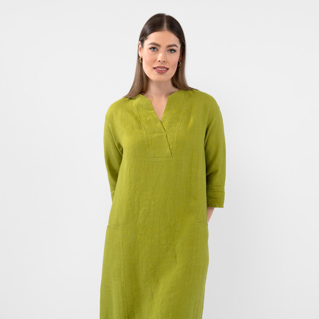 - Produktmodell: A-linje silhuett, avslappet passform, maxi-lengde, 3/4 ermer