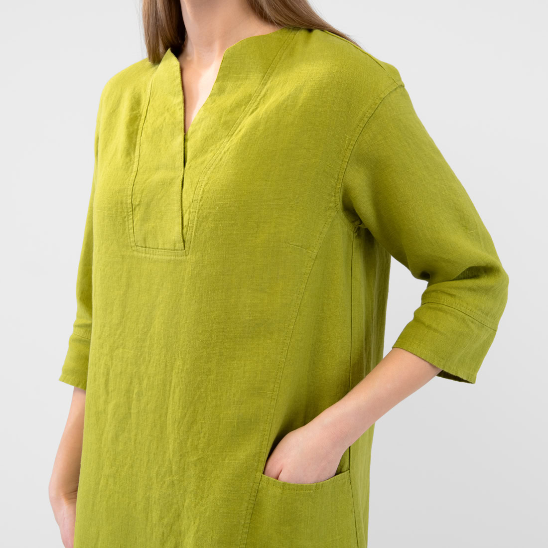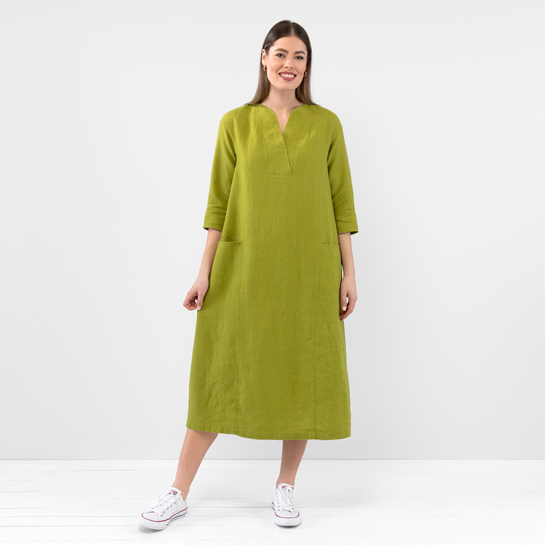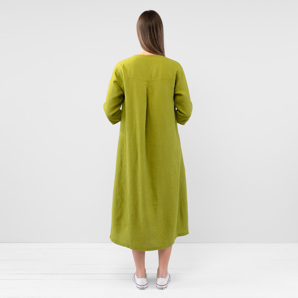 - Produktmodell: A-linje silhuett, avslappet passform, maxi-lengde, 3/4 ermer