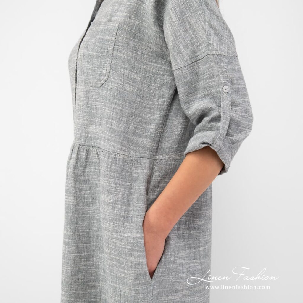 - Produktmodell: løs passform, lengde over kneet, 3/4 ermer med knappelukking