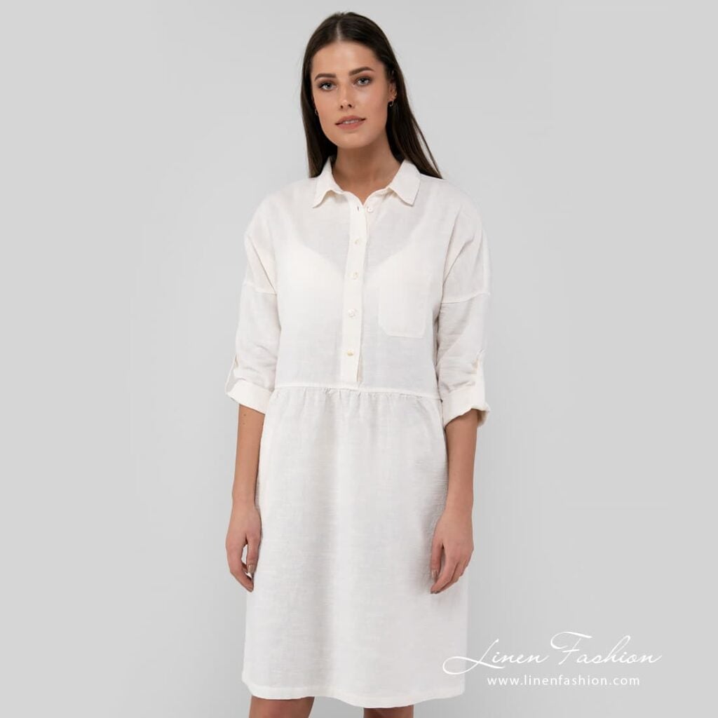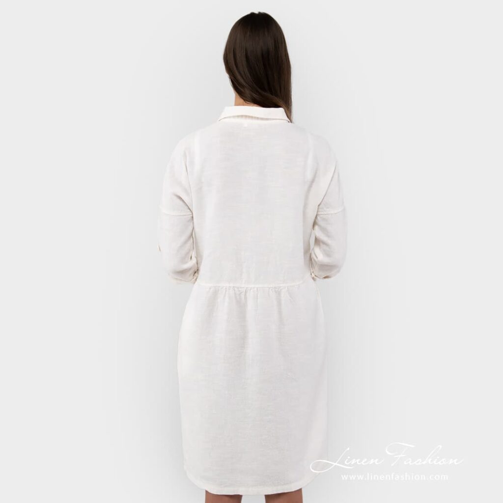 - Detaljer: klassisk skjortekrage, knappelukking, lomme på brystet, lommer på sidene, lett rynking i midjen