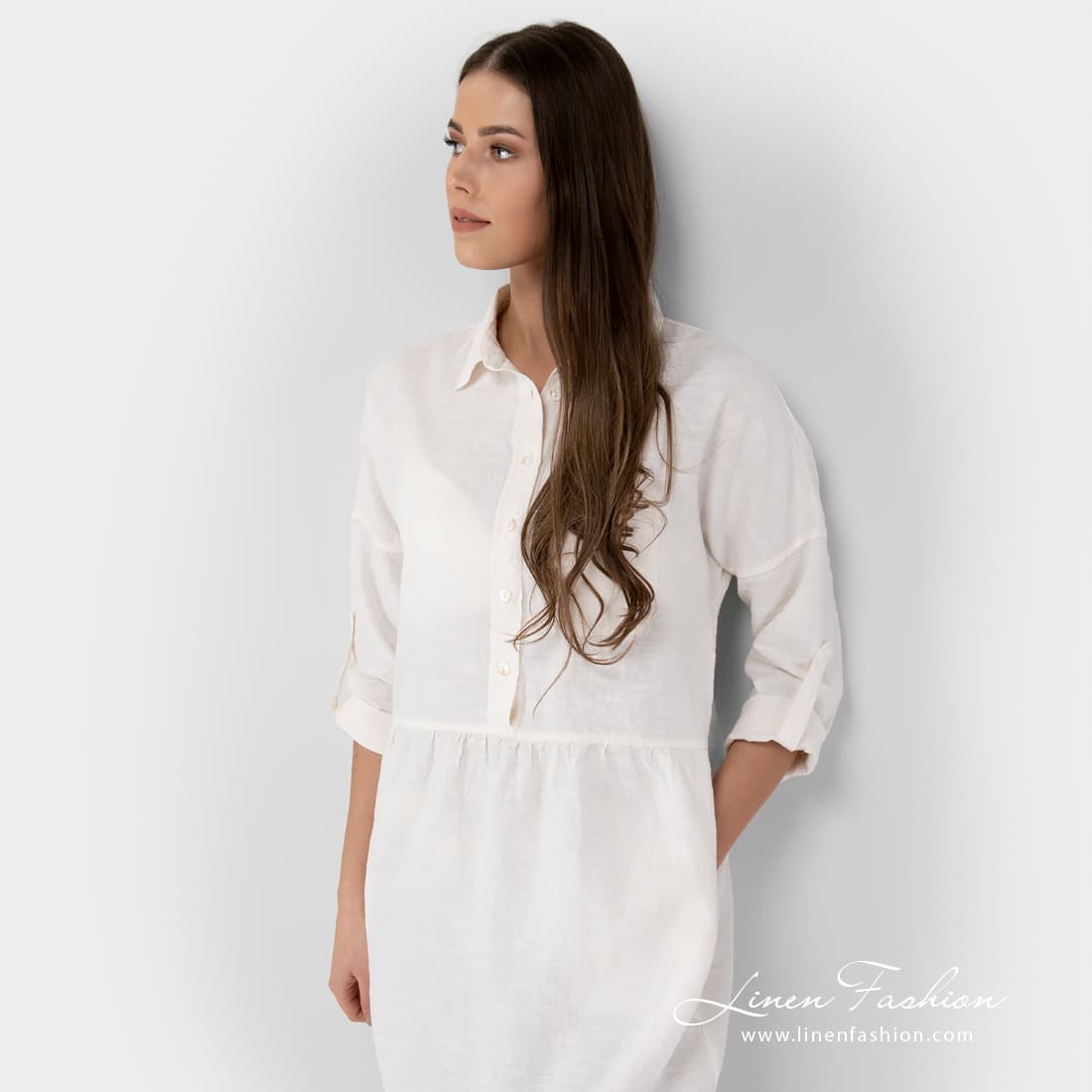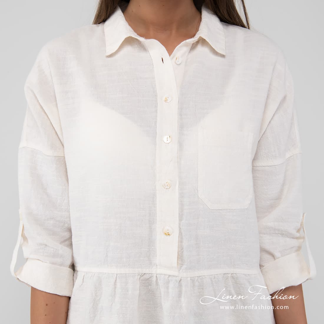 - Produktmodell: løs silhuett, lengde over kneet, 3/4 ermer med knappelukking