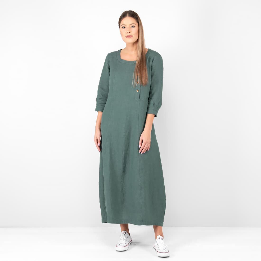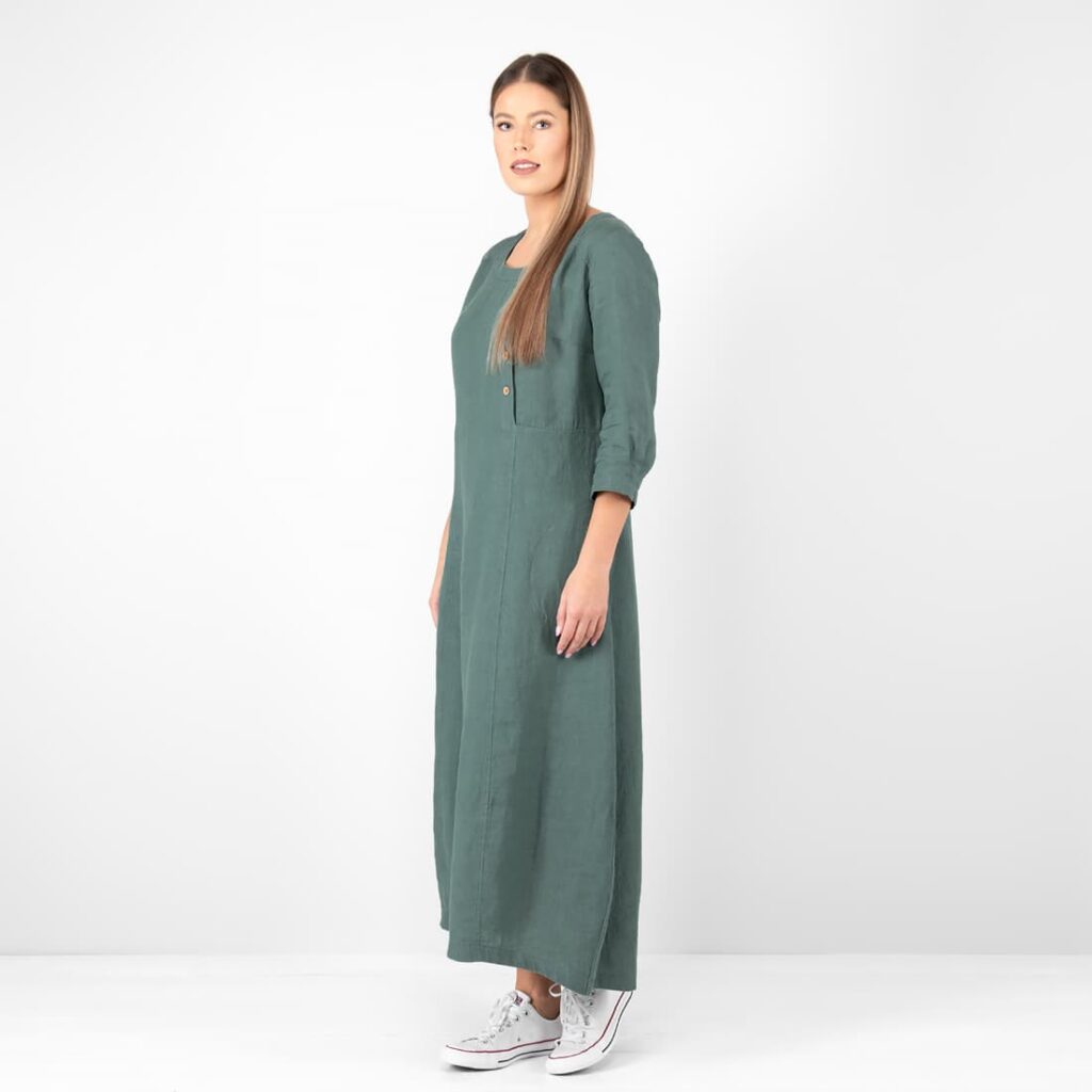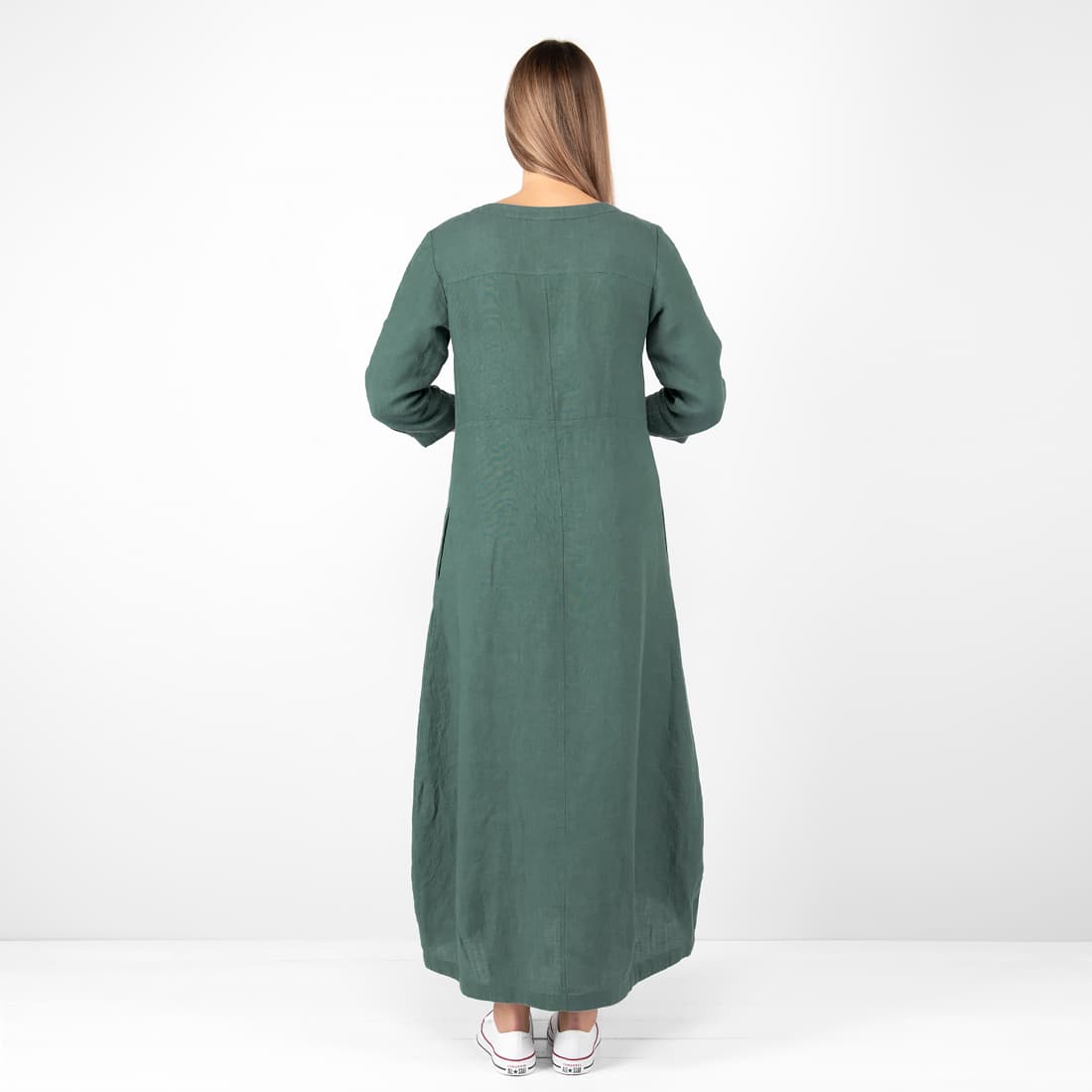 - Produktmodell: A-formet silhuett, maxi-lengde, 3/4-ermer med legg