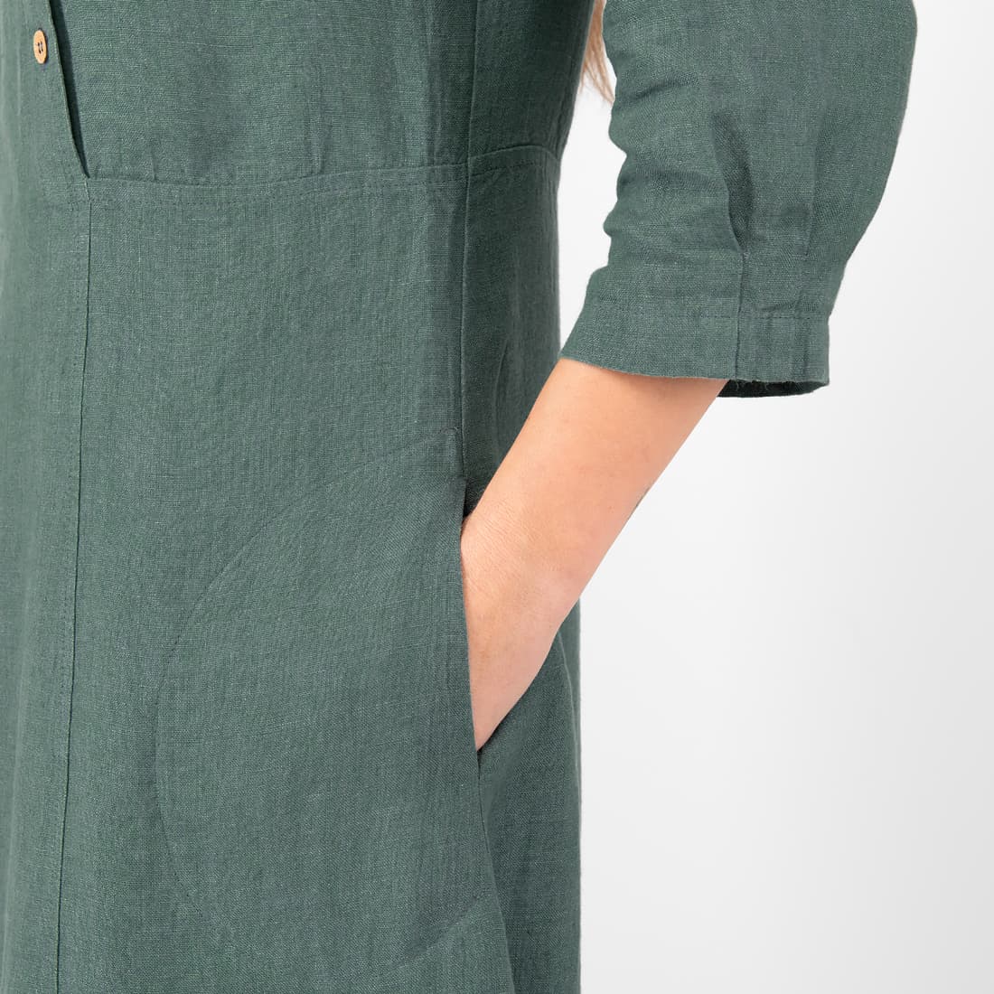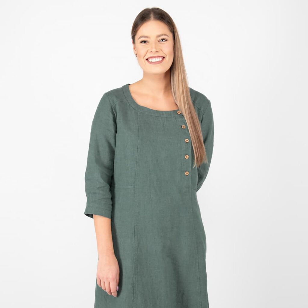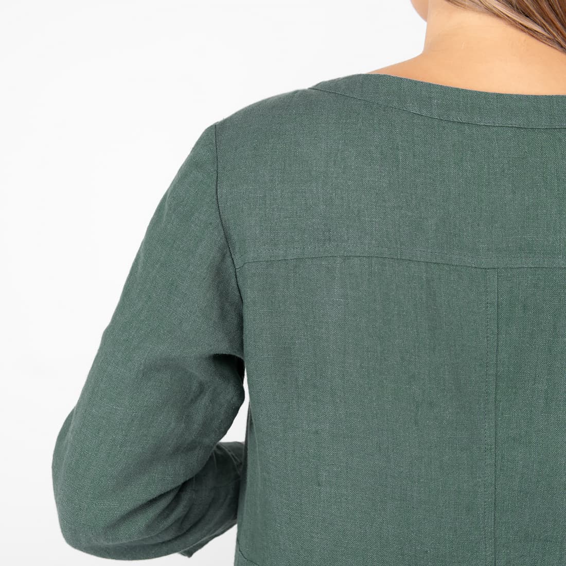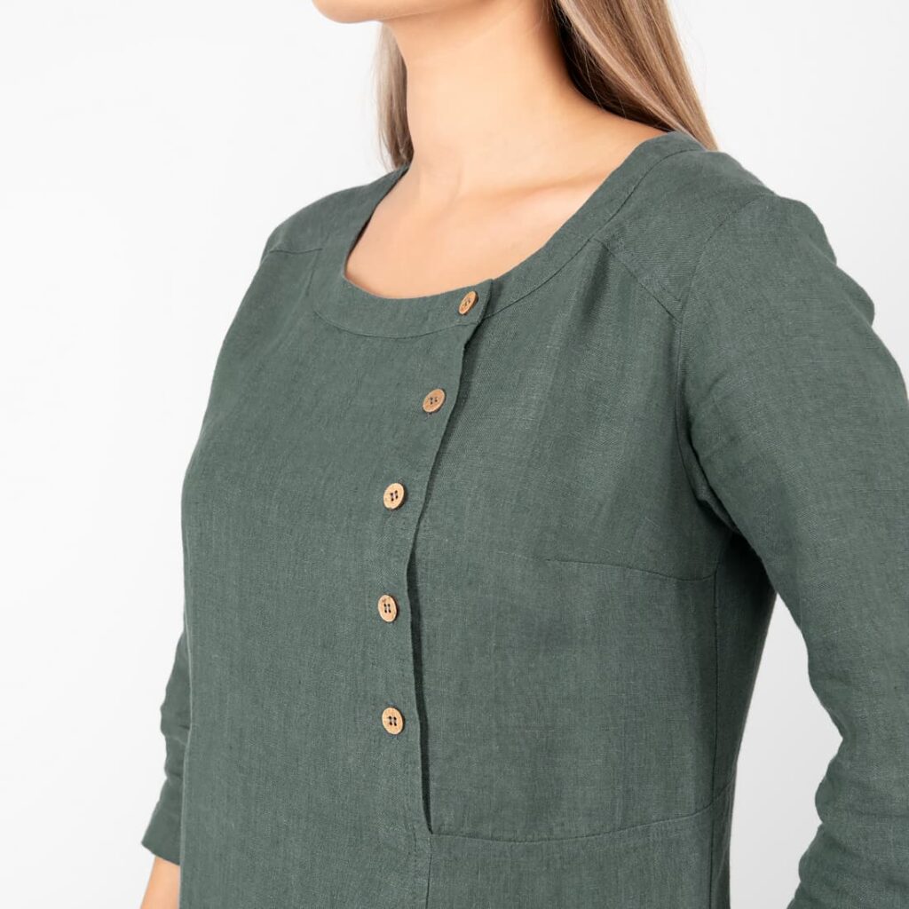 - Detaljer: rund halsutskjæring, litt lengre bak, asymmetrisk knapplukking foran, sidelommer