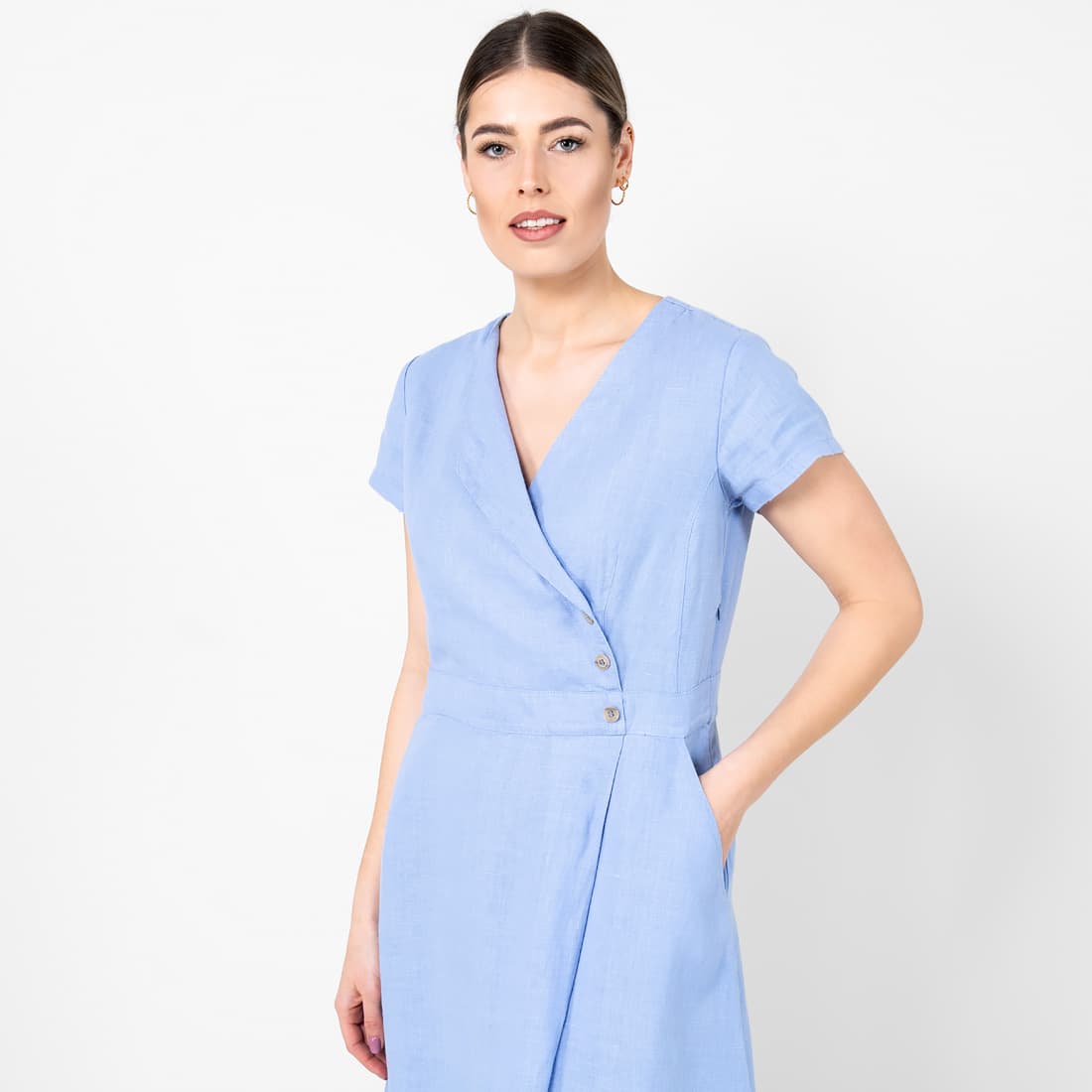 - Detaljer: V-hals med dekorativ fold foran, sidelommer, glidelåslukking i siden