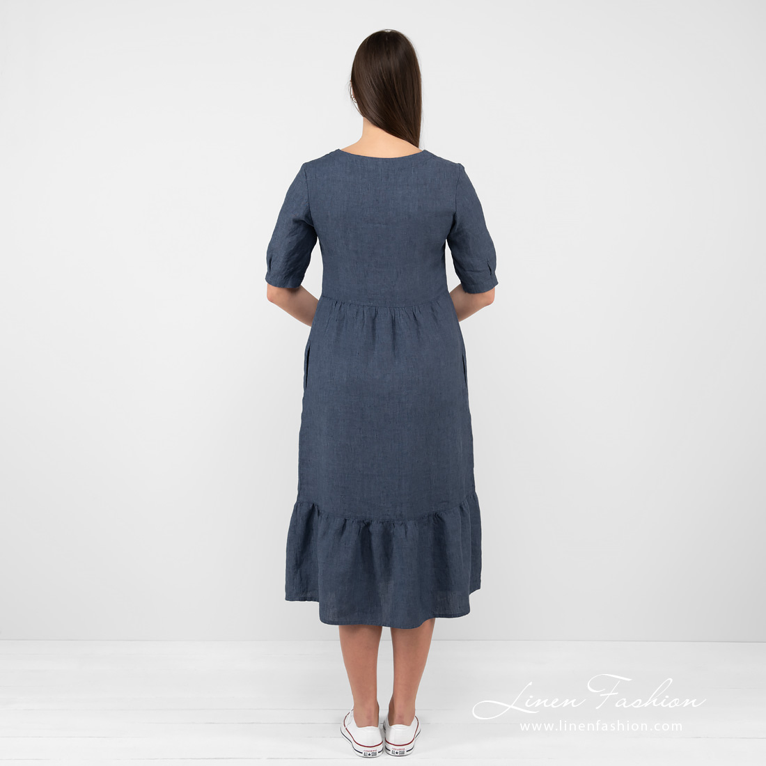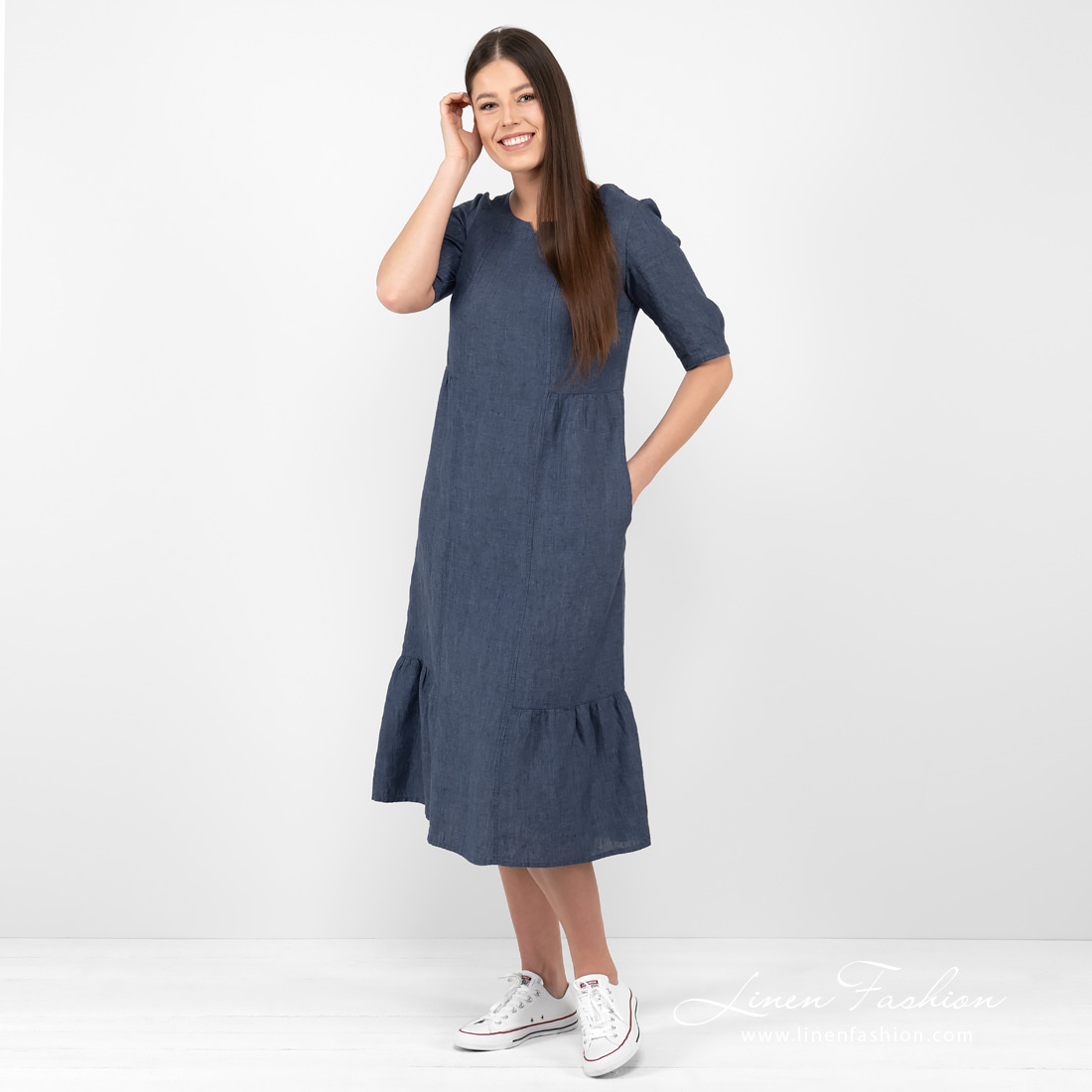 - Produktmodell: A-linje-silhuett, midi-lengde, albuelange ermer