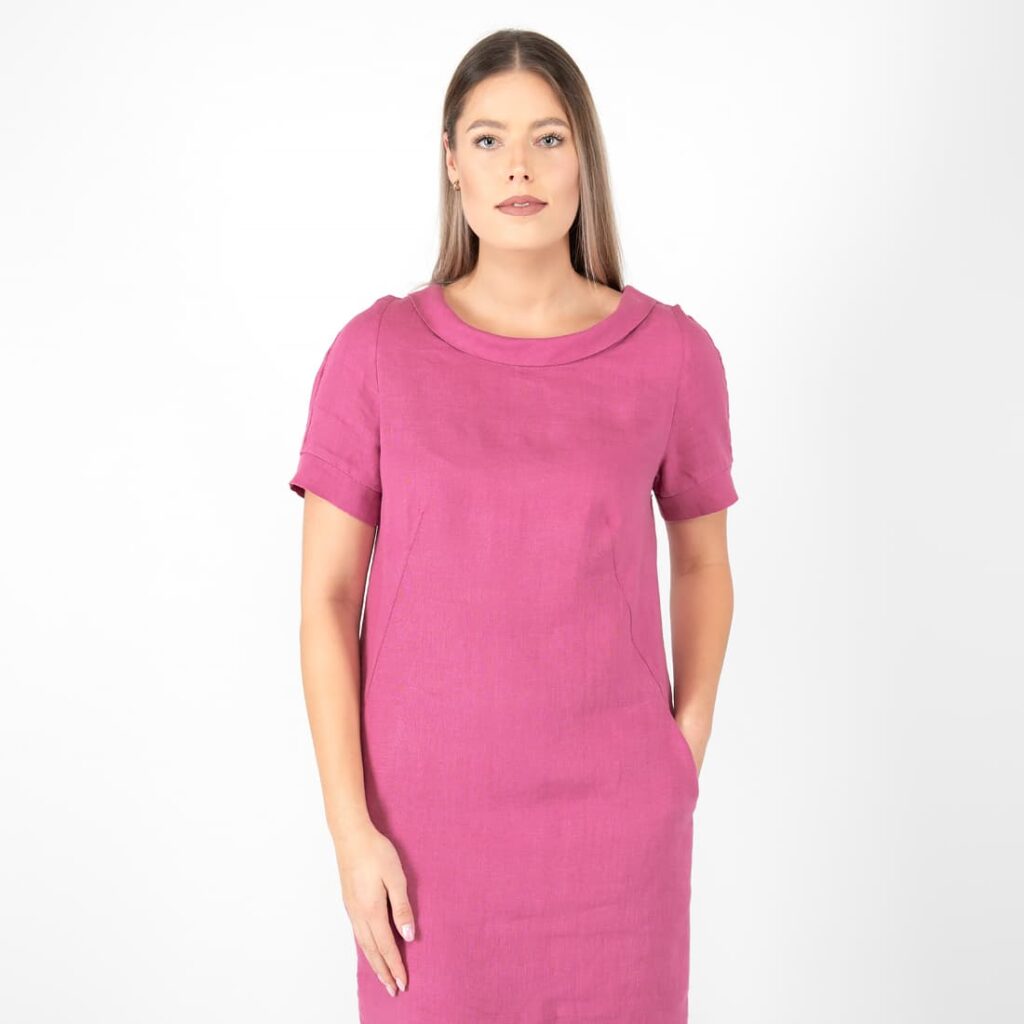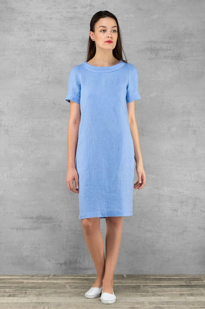 - Produktmodell: rett silhuett, knelang, korte ermer