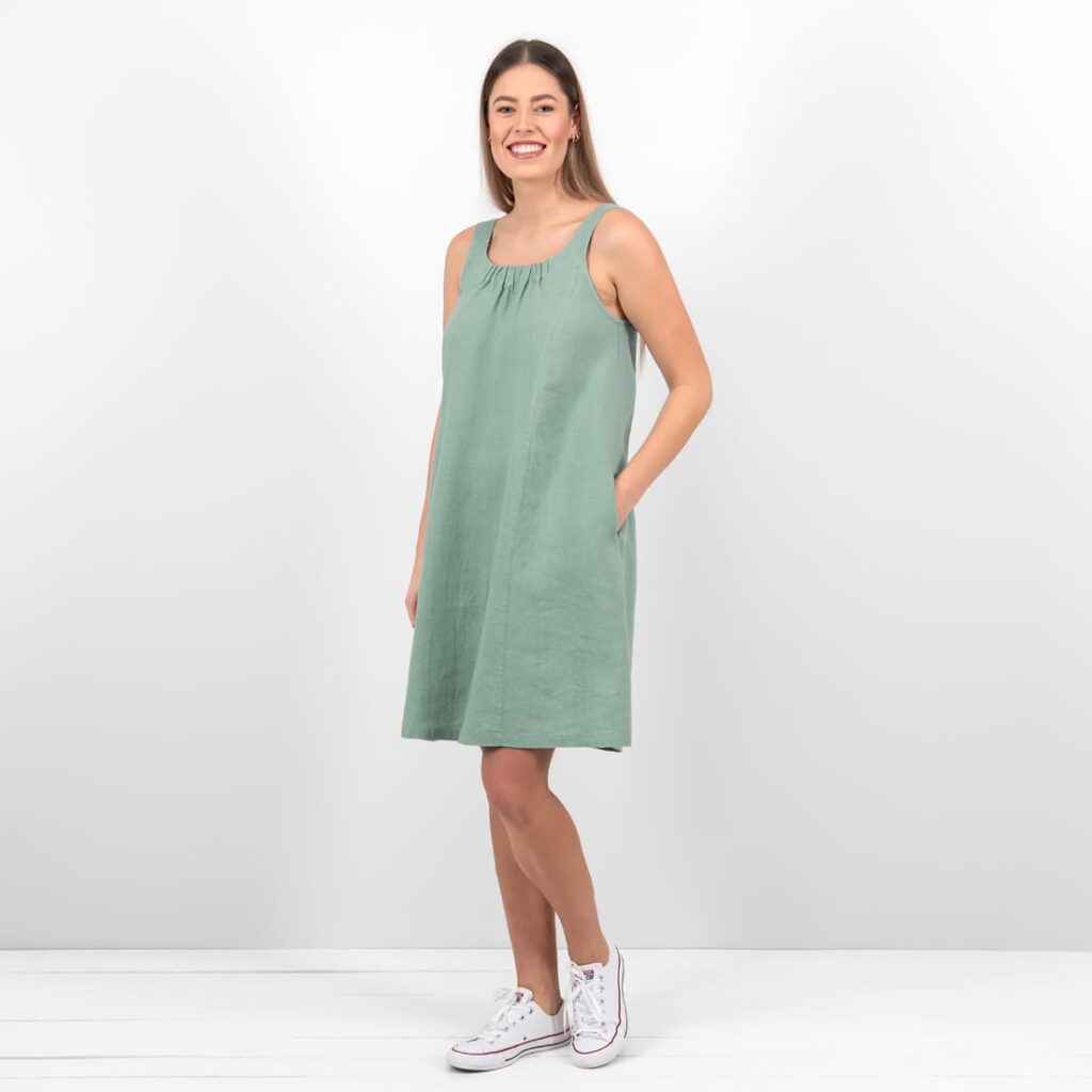 - Produktmodell: løs A-linje-silhuett, lengde over kneet, ermeløs