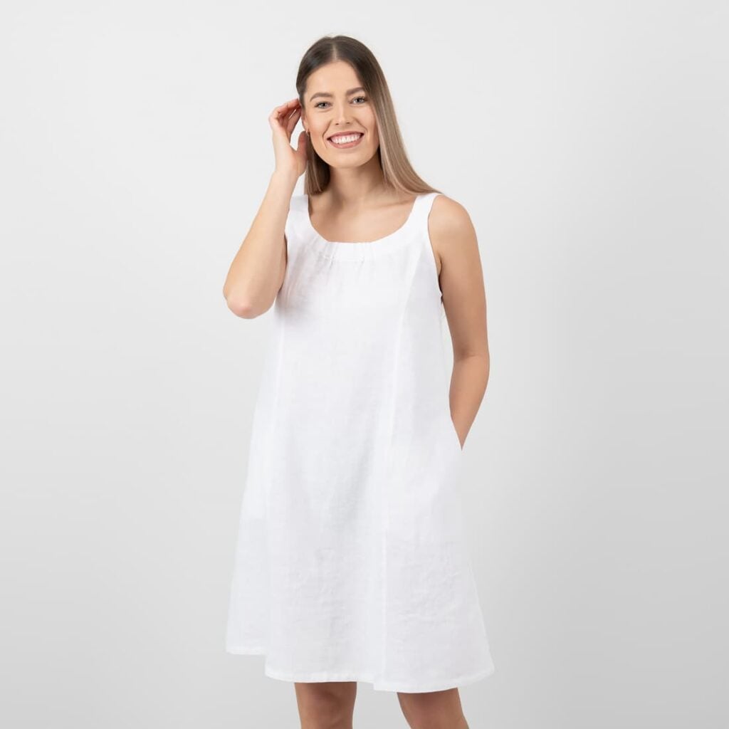 - Produktmodell: løs A-linje-silhuett, lengde over kneet, ermeløs