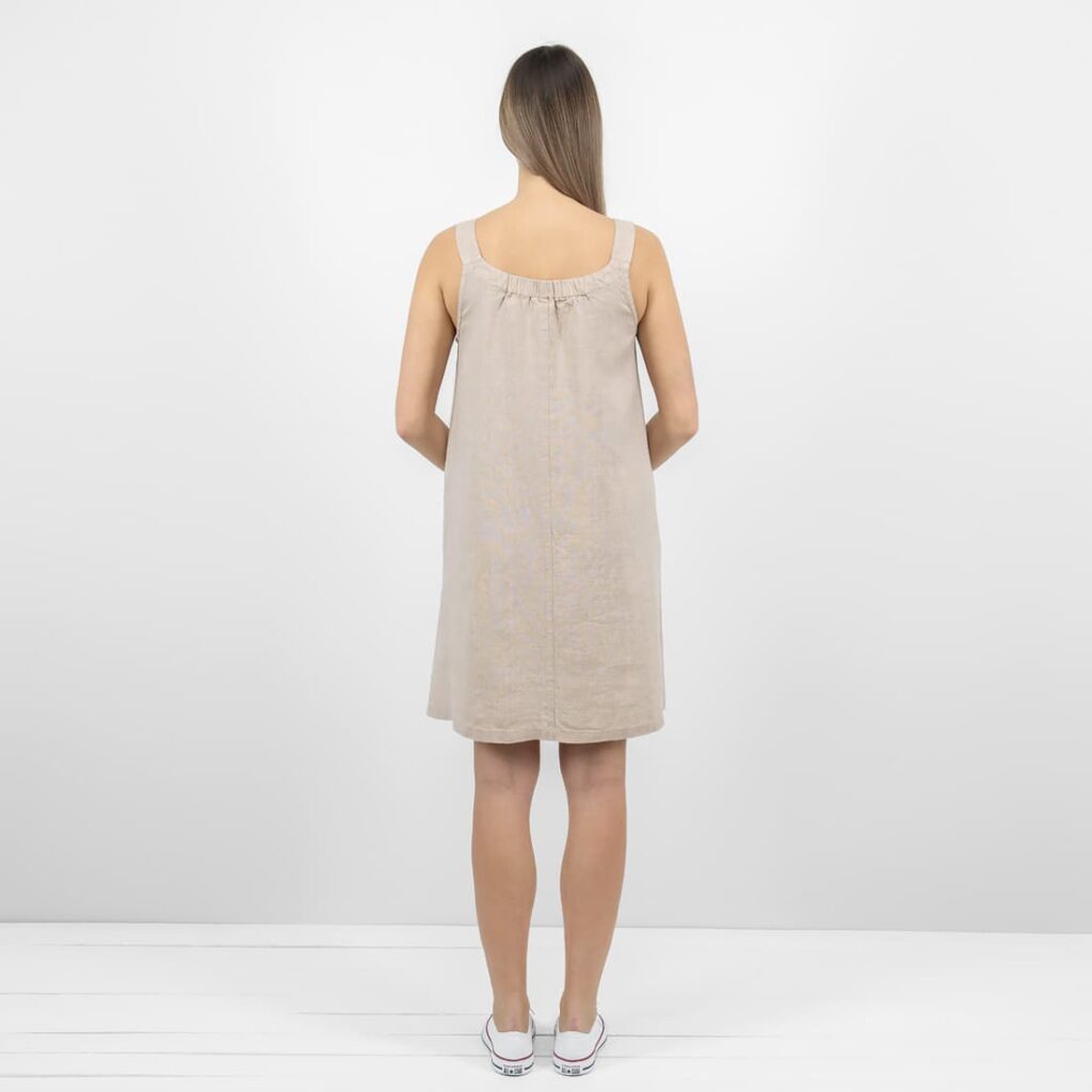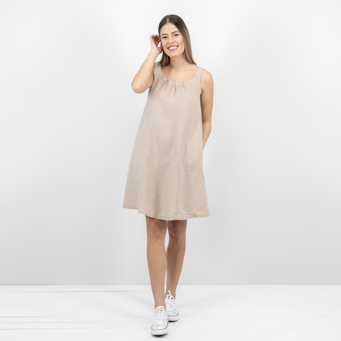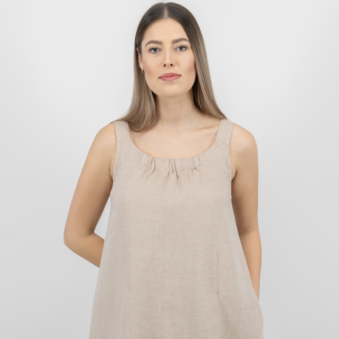 - Detaljer: rund plissert halsringning, brede stropper, med lommer