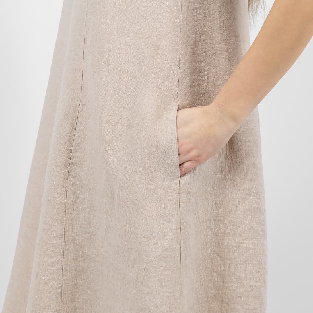 - Produktmodell: løs A-linje-silhuett, lengde over kneet, ermeløs