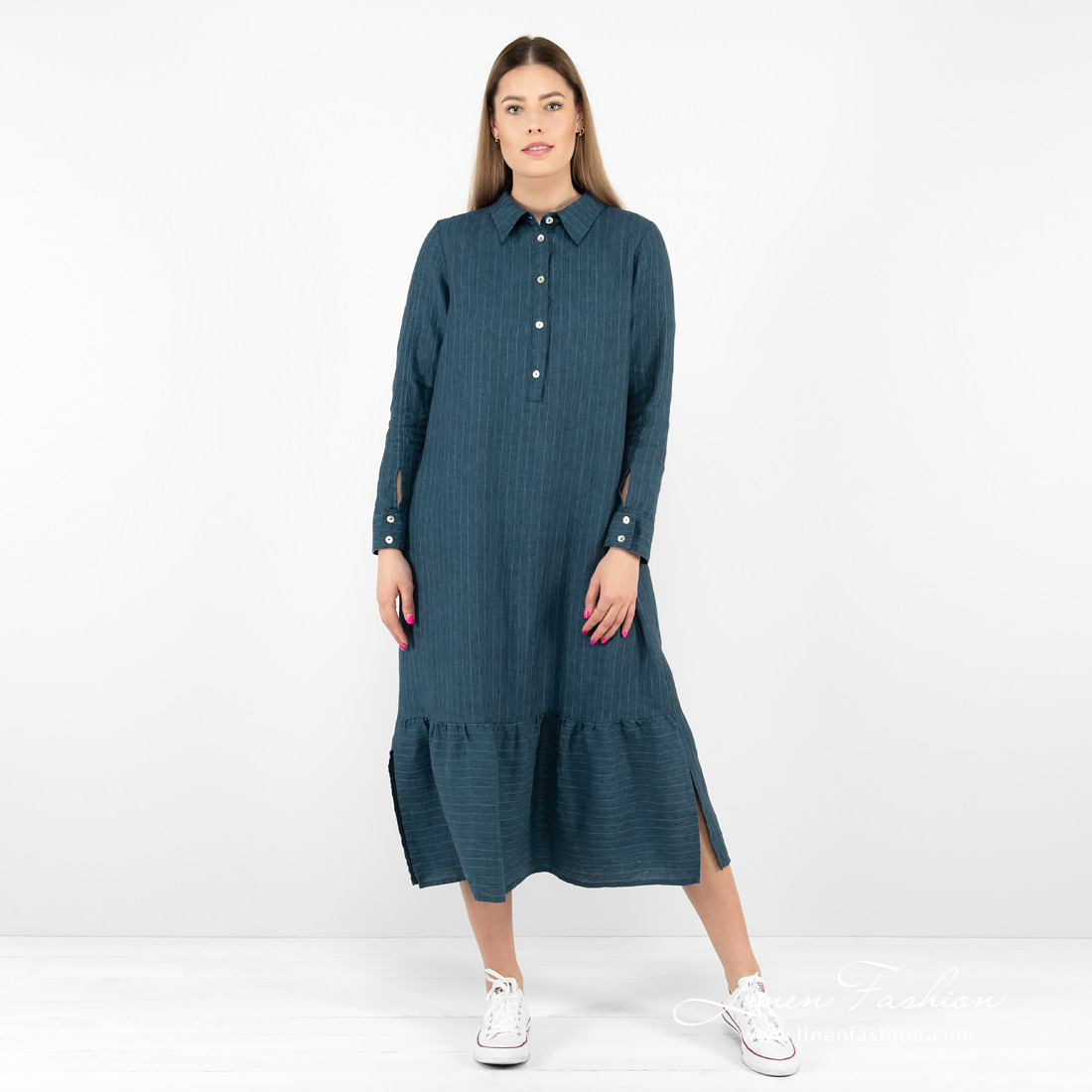 - Produktmodell: A-linje silhuett, løs passform, midilengde, lange ermer
