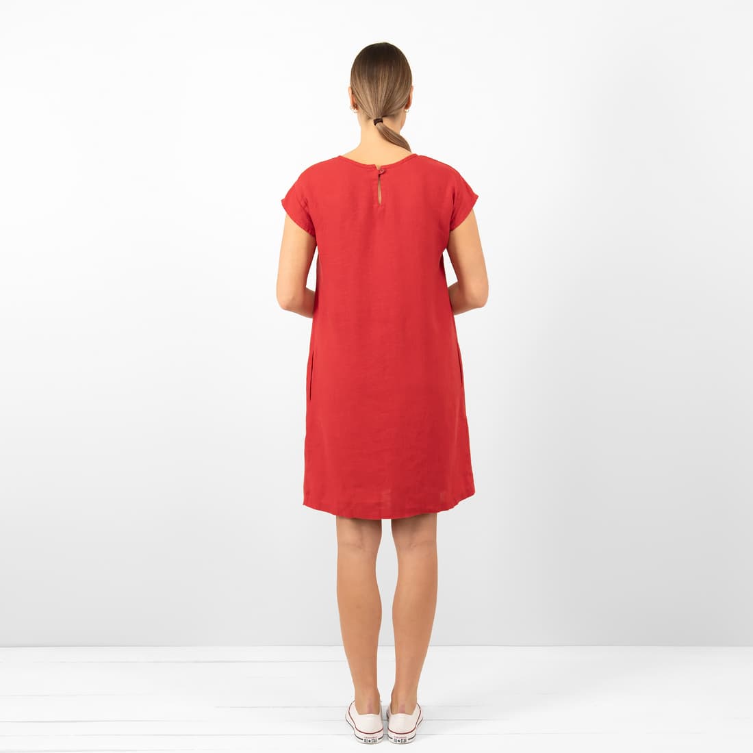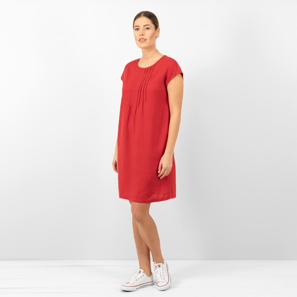 - Produktmodell: rett silhuett, løs passform, lengde over kneet, korte ermer