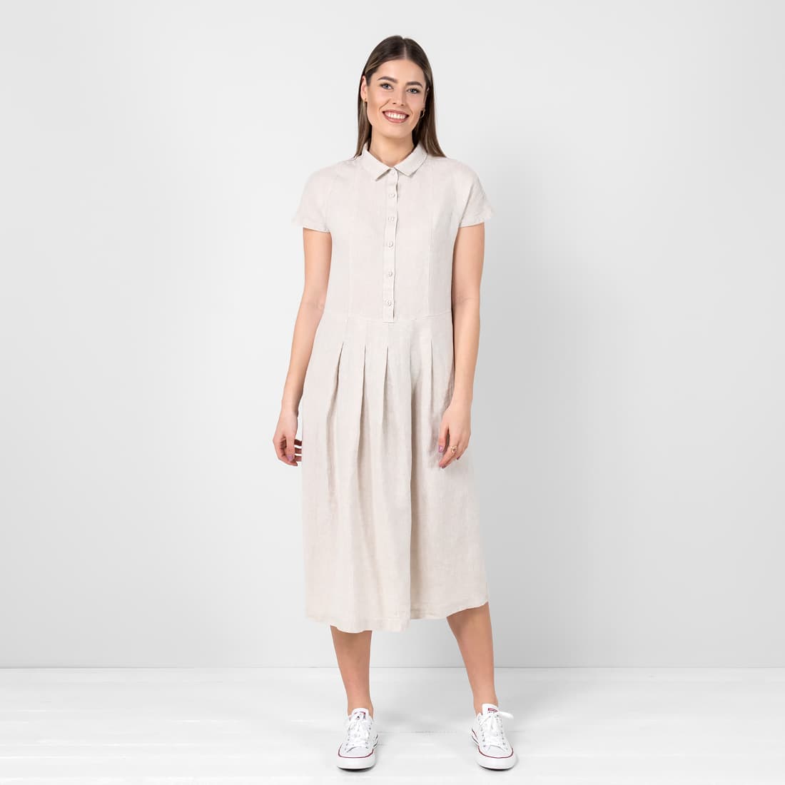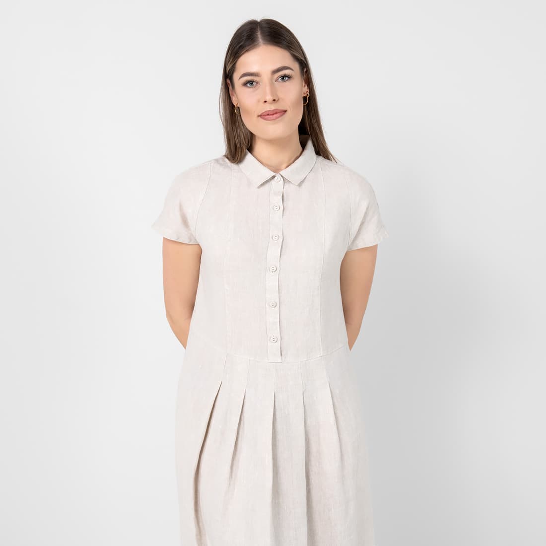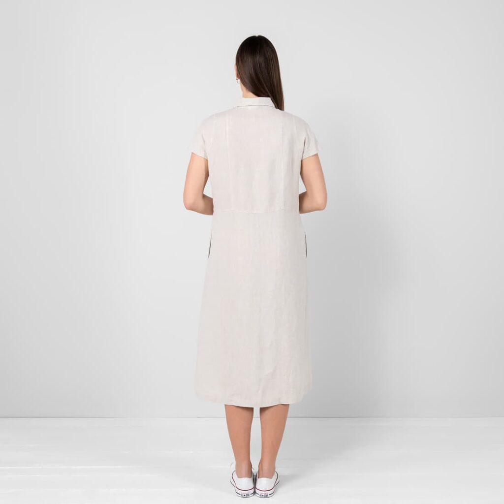 - Produktmodell: løs A-linje-silhuett, lengde under kneet, korte ermer
