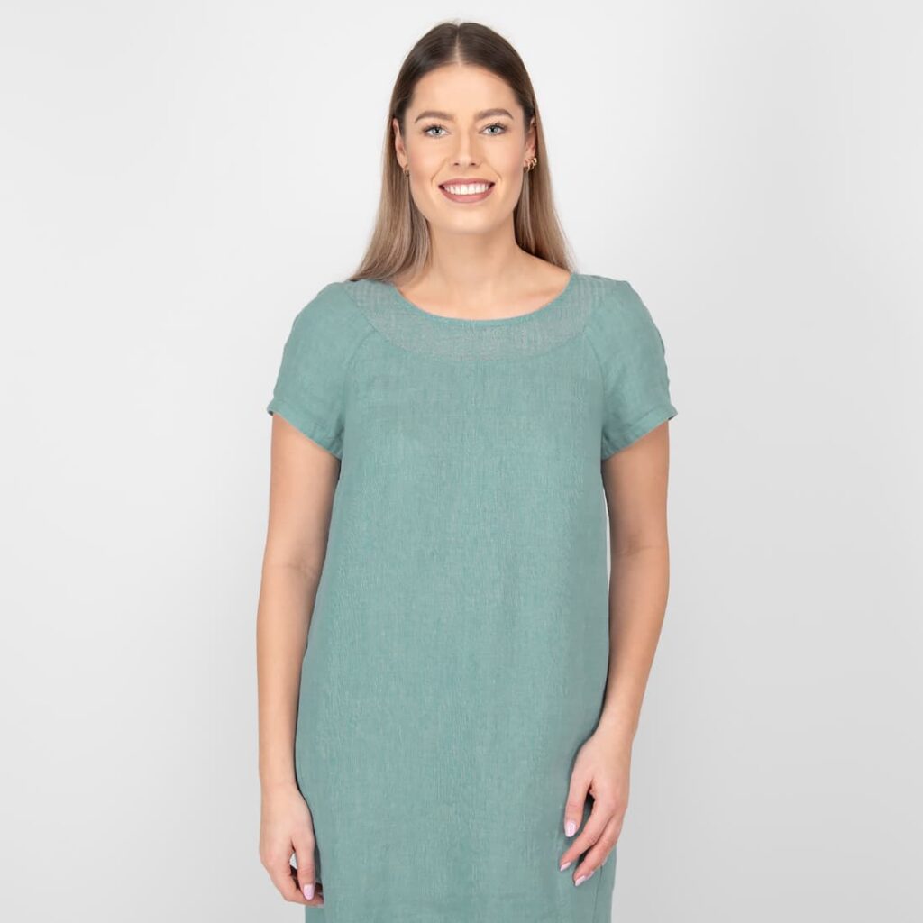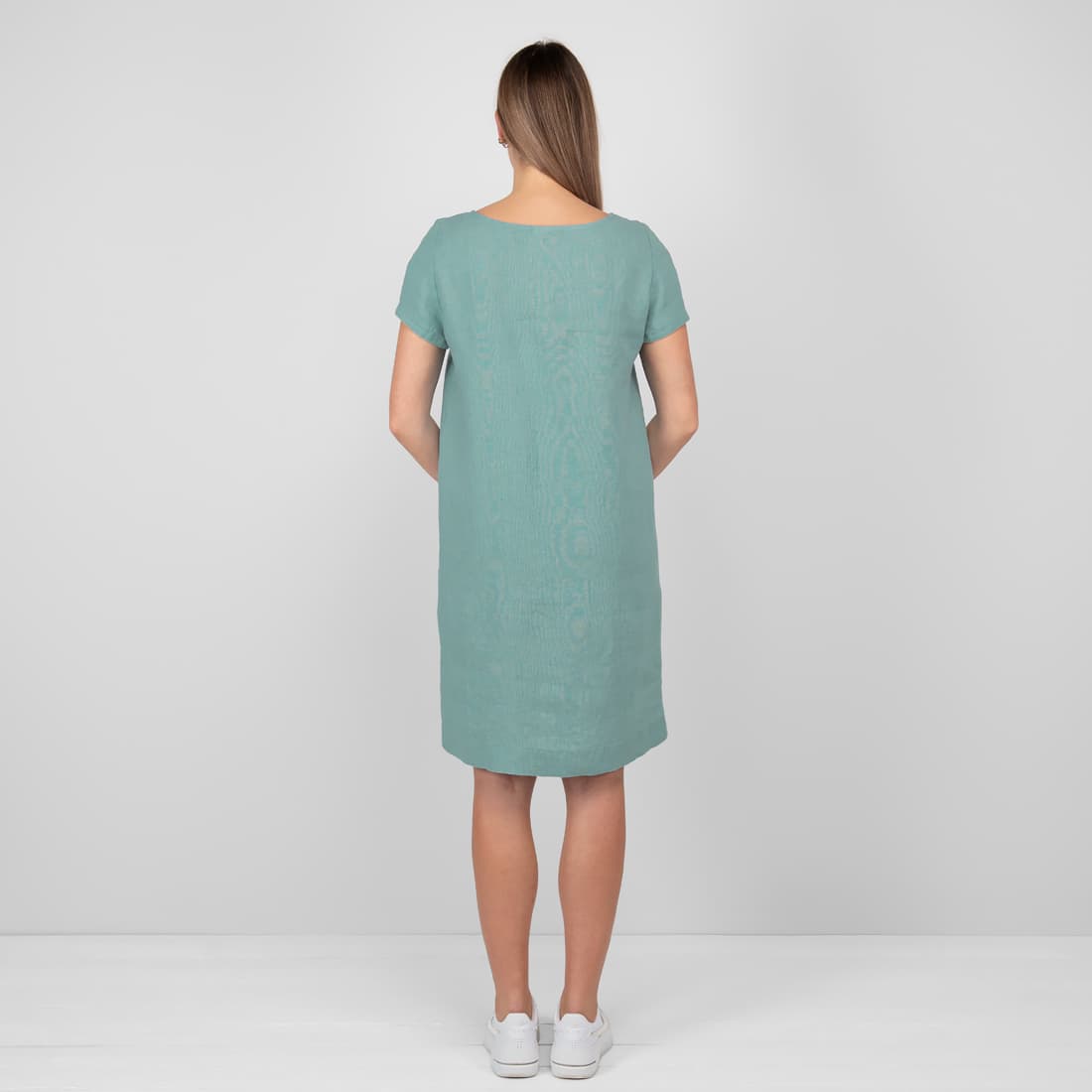 - Produktmodell: rett silhuett, løs passform, lengde over kneet, korte ermer