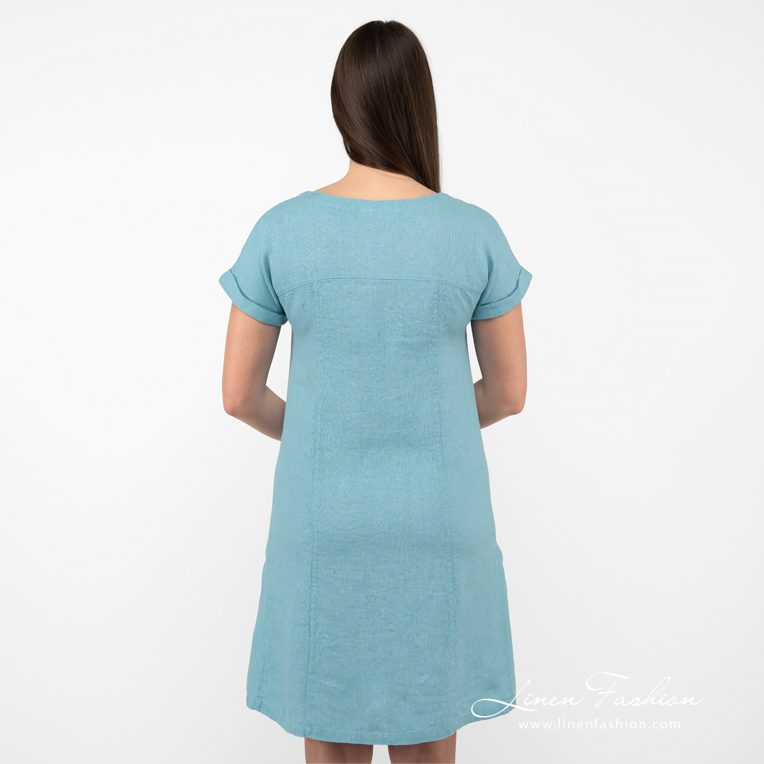 - Produktmodell: lett A-linje-silhuett, lengde over kneet, korte ermer